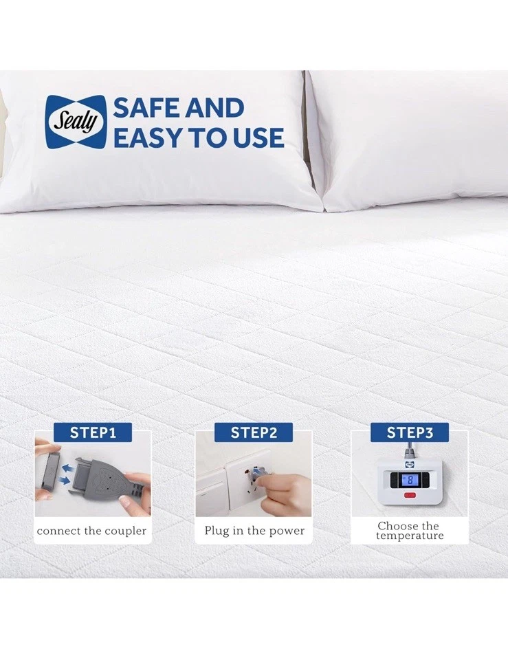 Open box new item! Coral Fleece(top Layer) ★【PREMIUM MATERIAL】 The top layer of this plush heated mattress pad is made of premium breathable Coral Fleece, known for its ultimate softness and plush texture, providing a luxurious feel against the skin. It also offers excellent thermal insulation, keeping you warm and dry by trapping body heat. Heated mattress pad with plush top is an ideal choice for those seeking comfort, warmth, and durability. ★【WHY CHOOSE SEALY HEATED MATTRESS PAD】If you are not a fan of getting into a cold bed, especially during the winter. This Sealy heated mattress pad is ideal to preheat the bed. Ultra comfort with coral fleece offers the best of both worlds. This electric mattress pad has deep pockets that fit most mattresses. The skirt contains strong elastic that helps it stay put. The padding on top is plush enough that there is no sensation of wires when lying on it, which makes for a great night sleep. ★【MAXIMUM SAFETY & WARMTH】Upgraded heating wire is adopted in the plush heated mattress pad, which has passed the ETL and FCC safety standard. Sealy electric mattress pad can promote blood circulation, help relieve muscle soreness and joint pain by providing heat therapy, and warm your cold hands and feet. ★【PROGRAMABLE CONTROLS】The heated mattress pad has 1-12 hours automatic power off and overheat protection, don't worry about forgetting to turn off the power, make you more assured; dual controller, 10 temperature gears, simple operating system make it easy to use, you can freely adjust your own optimal temperature. ★【EASY CARE & MACHINE WASHABLE】This heated mattress pad is machine washable, just unplug the power cord from the controller and throw it into the washing machine under 30℃ water temperature to wash, clean and durable. CAUTION: DO NOT DRY CLEAN. DO NOT BLEACH. DO NOT IRON.DO NOT PLUG IN AND POWER UP YOUR HEATED PRODUCT WHILE DAMP. DO NOT USE UNTIL IT IS COMPLETELY DRY.