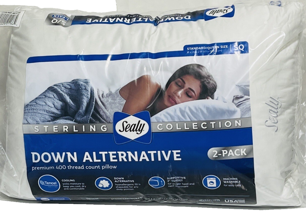 Sealy Sterling Down Alternative 400 Thread Count Pillow, Standard/Queen (2 Pack). NEW WITHOUT TAG - OPEN BOX - CUSTOMER RETURN FROM WHOLESALE. LUB -EXCELLENT CONDITION FREE SHIPPING Elevate your sleep experience with the Sealy Sterling Down Alternative Pillow. This modern pillow is perfect for families and adults alike, offering a solid pattern and a rectangular shape with dimensions of 18 x 26 x 2 inches for a queen-sized bed. The fill material is made of 100% polyester, making it comfortable and easy to care for. This pillow comes in a beautiful white color and is made of down and cotton materials. It has a zipper closure and is machine washable for easy cleaning. With features like cooling and a STANDARD 100 by OEKO-TEX certification, this Sealy pillow is an excellent choice for your bedroom.