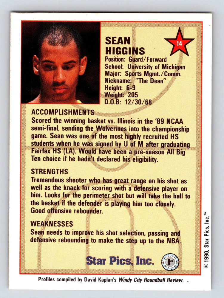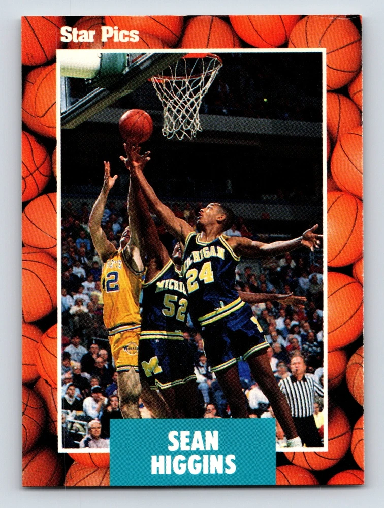 Item Description Title: Sean Higgins Guard Forward University Of Michigan 1990 Star Pics Card 14 Description: This sports trading card features Sean Higgins; a talented guard/forward from the University of Michigan. The card is part of the 1990 Star Pics collection; known for capturing college basketball stars before their professional careers. Higgins is celebrated for scoring the decisive basket against Illinois in the '89 NCAA semi-final; propelling the Wolverines to the championship game. Standing at 6'9 and weighing 205 pounds; Higgins was one of the top high school recruits before joining Michigan. His strengths include impressive shooting range and a knack for offensive rebounding. However; the card notes some areas for improvement; such as shot selection and defensive skills; as he transitioned to the NBA. This card is a valuable collectible for enthusiasts of college basketball history and Higgins' notable achievements. MRSP: $4.99 Sport: Basketball Player/Athlete: Sean Higgins Season: 1990 Manufacturer: Star Pics; Inc. Parallel/Variety: Unknown Set: Star Pics Basketball 1990 Team: University of Michigan League: NCAA Card Number: 14 Counter: 152 Folder: BASKETBALL1224002