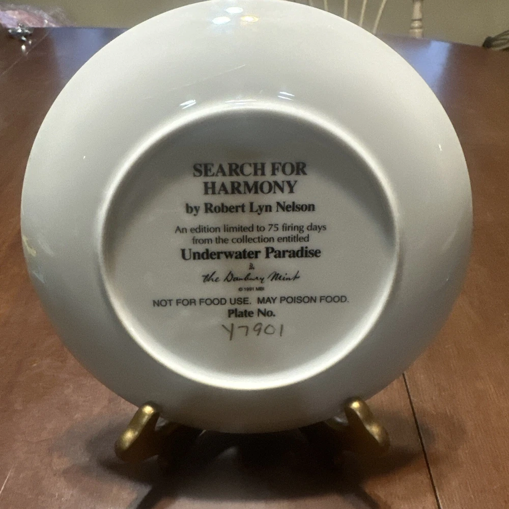 The product is a collector plate titled "Search For Harmony" by Robert Lyn Nelson, part of the Underwater Paradise Collection. Produced by Danbury Mint, this decorative plate is not intended for food use. The design likely features an underwater scene created by the renowned artist, perfect for collectors of decorative plates.
