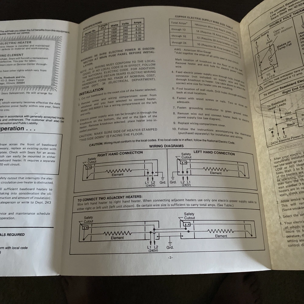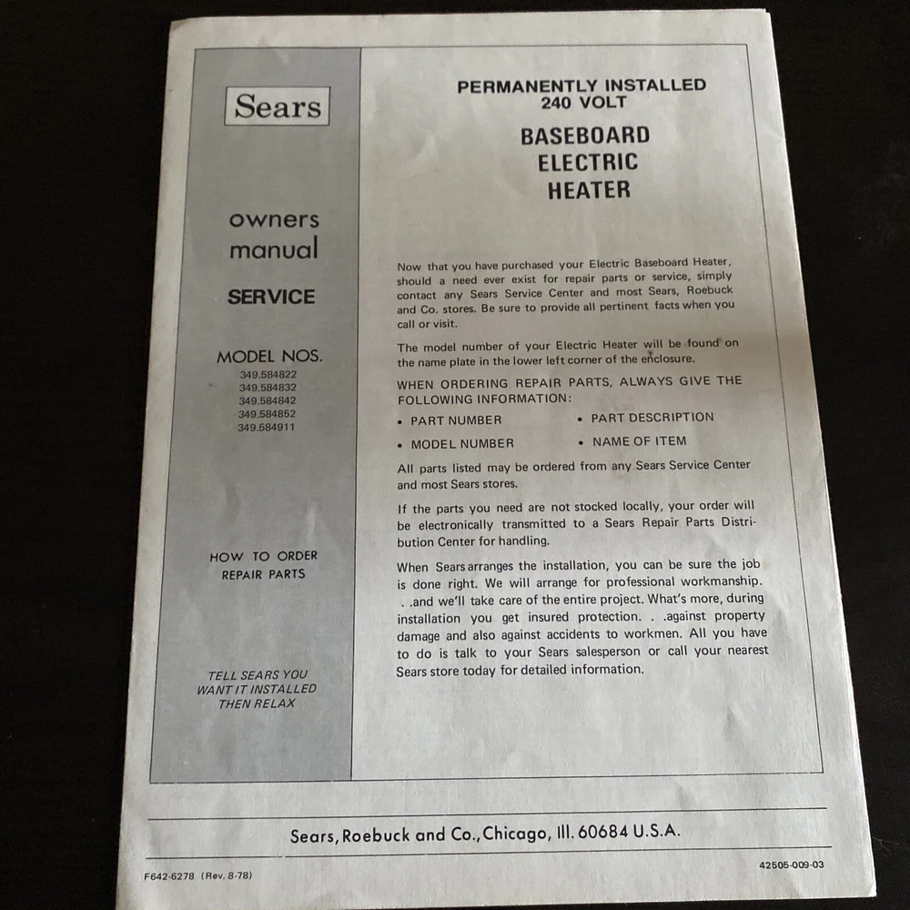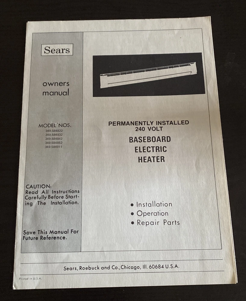 Sears Baseboard Electric Heater Owners Manual Vintage Instructions