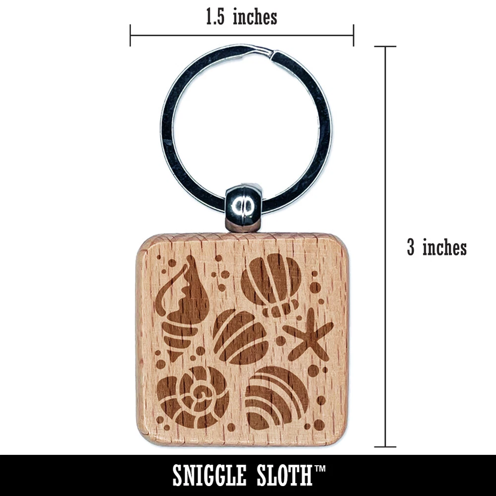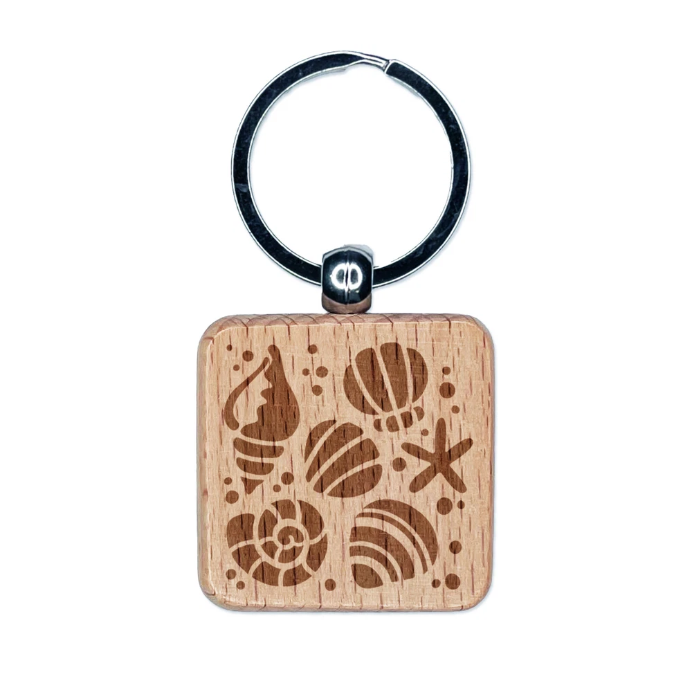 Seashells and Starfish Engraved Wood Square Keychain Tag Charm