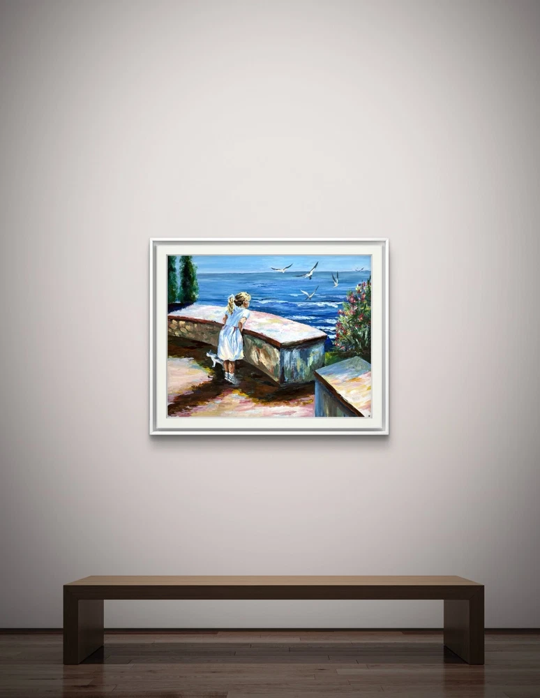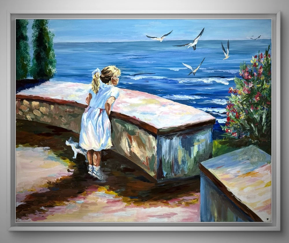 This beautiful hand-painted artwork captures a serene seaside scene, featuring a young girl gazing thoughtfully at the ocean waves. Dressed in a flowing white dress, she stands near a stone railing, accompanied by a small white cat at her feet. The vibrant blue sea is alive with gentle waves and soaring seagulls, while colorful flowers add a touch of warmth to the composition. This painting evokes a sense of calm and nostalgia, making it a perfect addition to any home or office decor. Details: Medium: Oil on canvas Style: Impressionistic Frame: Included, elegant white Dimensions: [40*50] Condition: Brand new, ready to hang This artwork is ideal for lovers of seaside landscapes, impressionist paintings, or those looking to add a touch of tranquility to their space. A unique piece that invites peaceful reflection.