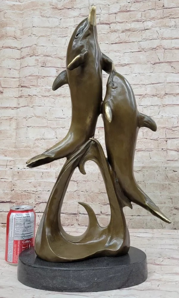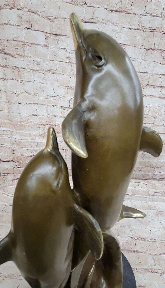 Seaside Serenity: Intricately Detailed Bronze Dolphins Figurine Signed Milo Gift Seaside Serenity: Intricately Detailed Bronze Dolphins Figurine Signed Milo Gift Condition : This sculpture is in perfect condition. Bronze Dimensions with Marble Base: Height 21" X Width 12" Marble Dimensions: Diameter 10.5" Height without base:19" Weight:26 LBS Inventory:19YDW09913991 2 Dolphins Swimming and Dancing Together Create a mesmerizing focal point in your landscape or hardscape design with the captivating "2 Dolphins Swimming and Dancing Together" Bronze Sculpture. This magnificent artwork beautifully portrays the playful nature of dolphins as they leap out of the water, capturing the essence of these friendly marine creatures. Handcrafted with meticulous attention to detail, this sculpture showcases the skill and artistry of renowned artist Miguel Lopez. Every curve and contour of the dolphins' bodies is intricately crafted to evoke a sense of grace and movement. The lustrous brown patina finish adds a touch of elegance, while the expertly applied gold highlights accentuate the fine details and bring an element of enchantment to the artwork. Whether placed in your garden, by the poolside, or as a centerpiece in your outdoor space, this bronze sculpture will add a touch of beauty and tranquility to any setting. The durable construction ensures its longevity, allowing you to enjoy the artistic allure for years to come. As a testament to its authenticity and craftsmanship, this sculpture is signed by the talented artist Miguel Lopez. Each piece is meticulously handcrafted using traditional techniques, including the lost-wax casting method, ensuring that you are acquiring a unique and timeless work of art. Elevate your outdoor environment with the captivating allure of the "2 Dolphins Swimming and Dancing Together" Bronze Sculpture. Let the harmonious presence of these majestic creatures bring a sense of joy, serenity, and wonder to your outdoor oasis. Signed Original Artwork by Miguel Lopez Two Dancing Dolphins Bronze Sculpture www.bronzhaus.com Video will open in a new window Using the eBay App? Paste link into a browser window: [isdntekvideo] Shipping Terms : Most of our items are shipped via USPS (United States Postal Service) mail or UPS. Most orders are shipped within 24-48 hours of purchase. Please be aware that not all items are available for USPS shipping due to size and weight. We do ship to Hawaii, Alaska, Canada, Puerto Rico, APO/AE, and U.S. Virgin Islands, however, an additional charge may be required. Please contact us before making any purchases in these areas. For Non-USA customers, you may be responsible for all duty, tax, brokerage fees that may be due upon delivery (shipping costs cover freight charges only). We also ship internationally. Please refer to the "Shipping and Handling" chart for the rates for each area. Payment : We accept just about any form of payment. PayPal, Master Card, Visa or American Express credit cards. Money orders, cashiers checks, and even personal or business checks. For governmental institutions, we will also accept a purchase order. Please understand that for personal or business checks we have to wait for the check to clear (usually 7 days) before shipping. Condition : New Detailed Hand Crafted Hot Cast Bronze Satisfaction Guaranteed. This is Stock Photo, Slight Color Variation!! Listing and template services provided by inkFrog