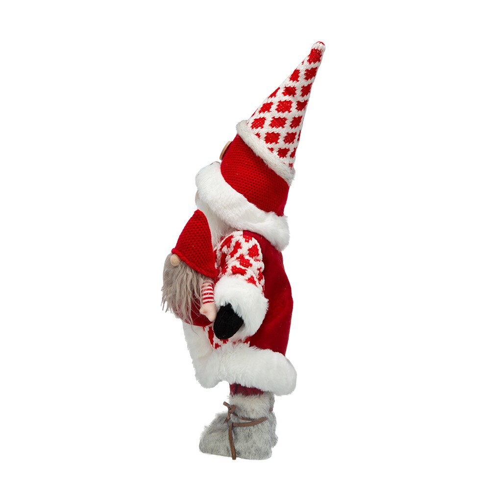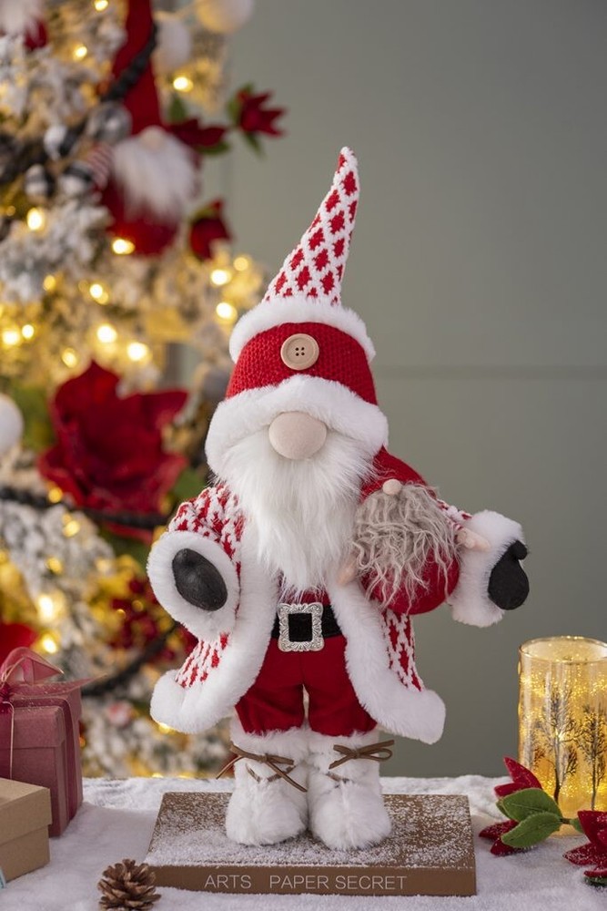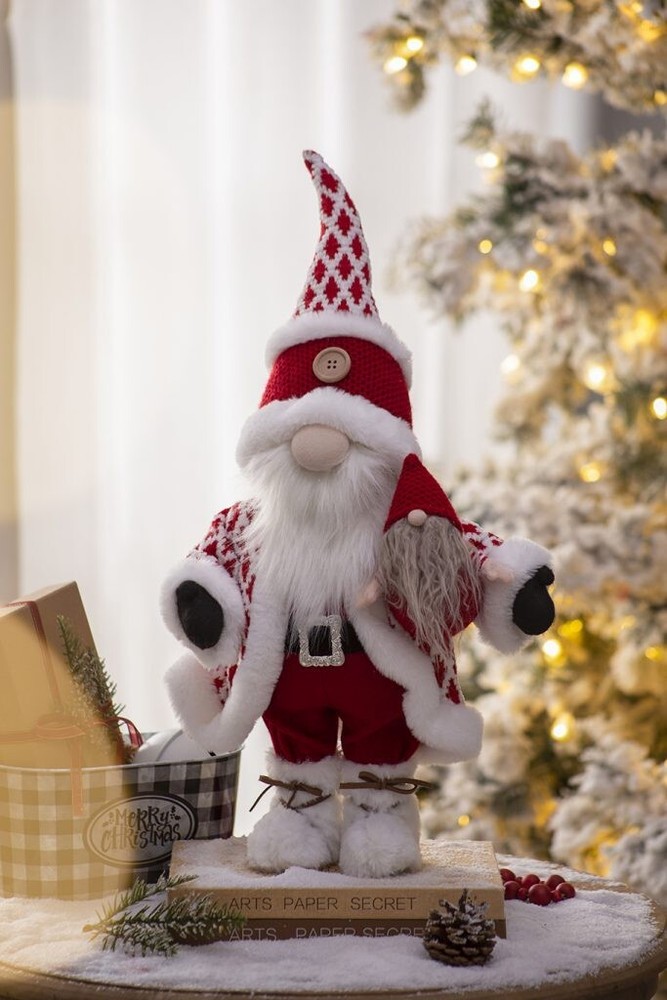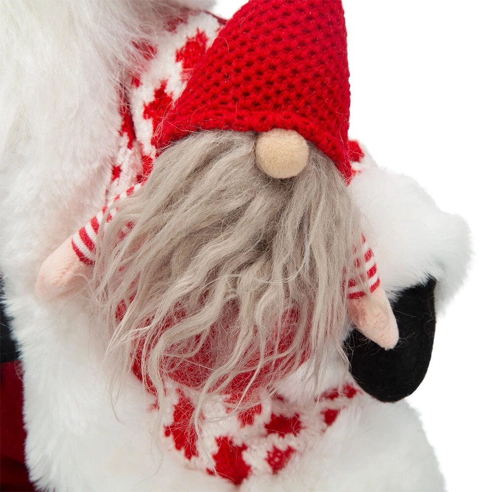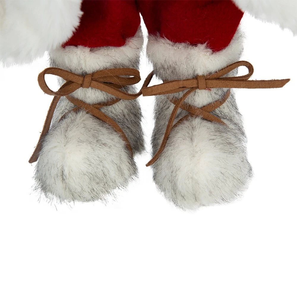 SEASONAL ABODE NEW WITH TAGS Santa Claus Gnome large Christmas decoration. 20" high. White faux fur trim beard, boots, jacket, hat and wooden button.