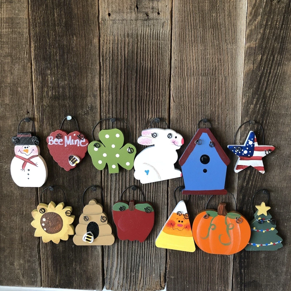 This Seasonal Camper comes with 12 interchangeable pieces. One for each month of the year. The Camper measures 11” wide X 8” tall and is ready to hang on your wall. The changeable pieces measure approximately 2 1/2”.
