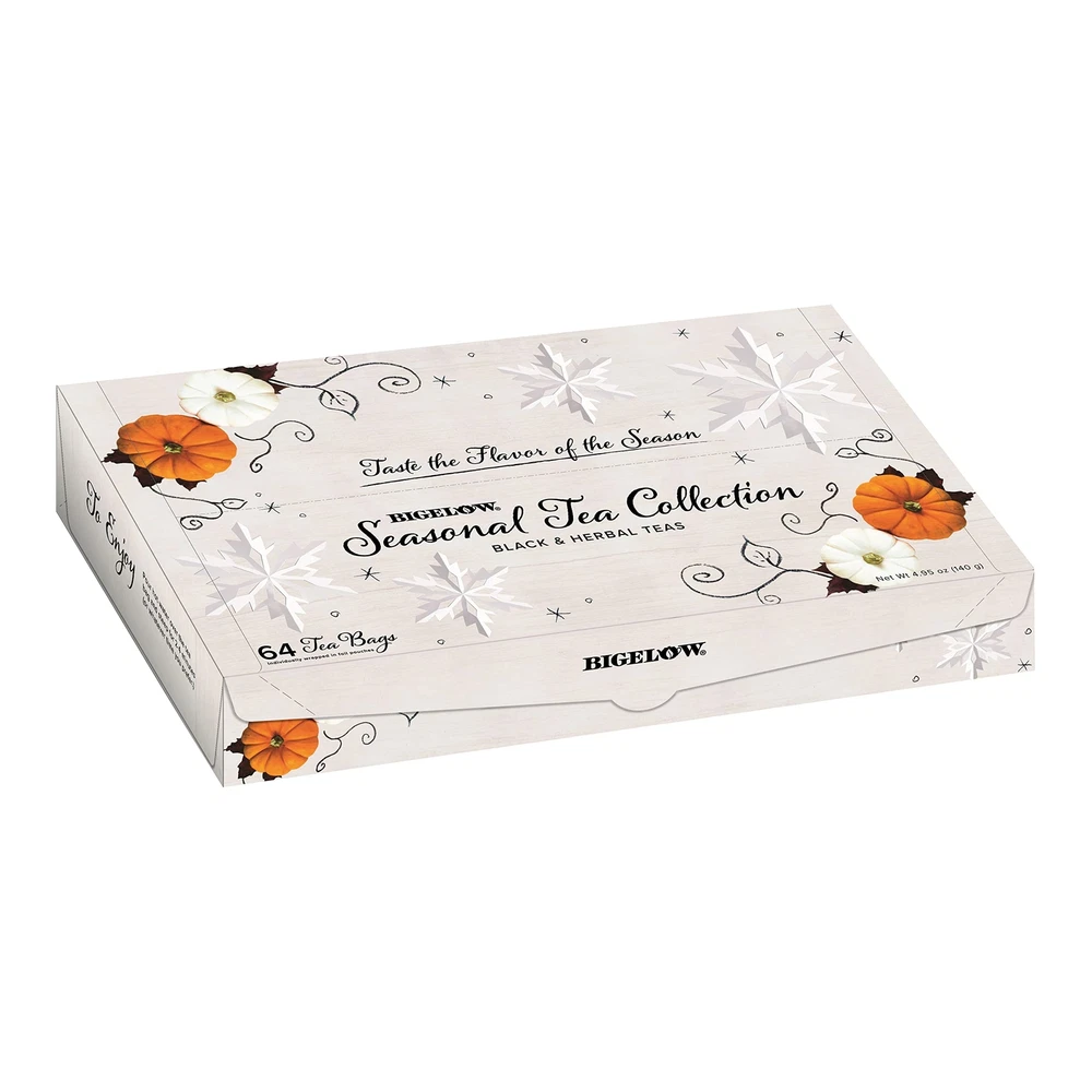 For over 75 years the Bigelow Family has poured their passion and dedication into one thing, tea. For generations, the skilled art of crafting the world’s finest teas remains the family’s top priority. Because tea is all we do. Seasonal Tea Collection: Includes 8 tea bags each of caffeinated black teas, Pumpkin Spice, Salted Caramel, Hot Cinnamon, Eggnogg’n, Caramel Apple and 8 tea bags each of caffeine free herbal teas Cranberry Harvest, Peppermint Bark and Ginger Snappish Perfect Tea Lover Gift: This indulgent blend of teas makes a great hostess gift, stocking stuffer, teachers gift and more; Ideal for entertaining too Individually Wrapped: always come individually wrapped in foil pouches for peak flavor, freshness and aroma to enjoy everywhere you go. Gluten-free, calorie-free, and Kosher Certified Blended and Packaged in the USA: In 1945 Ruth Campbell Bigelow created our first tea, Constant Comment, a strong, flavorful black tea blended with aromatic orange peel and sweet warming spices. Today, Bigelow is still 100 percent Family Owned Uncompromised Quality: Since 1945, has been a leader in premium tea and proud to be a Certified B Corporation - meeting the highest verified standards of social and environmental performance, transparency and accountability