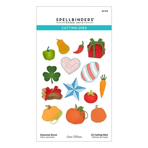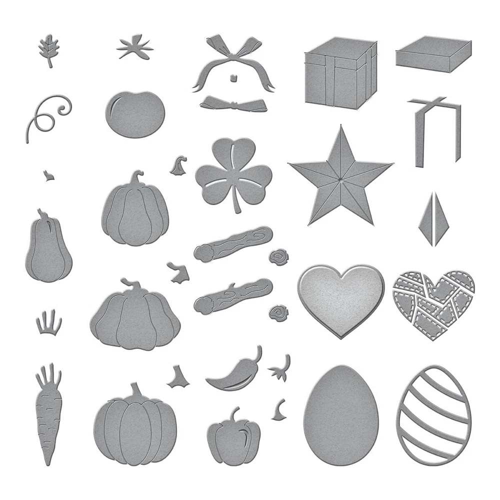 Seasonal Décor Etched Dies are part of the Country Road Collection by Annie Williams. Fill a wheelbarrow with these goodies in this set of 23 thin metal cutting dies! Not only can you load up veggies but sprinkle a few holiday accents in too. Great set to add for all year round! Works well with S4-1279 Country Wheelbarrow. Country Road is Annie Williams’ debut collection with . This offering creates a wonderful rural backdrop. It includes all the details such as a wheelbarrow, florals, wooden signs to even fencing parts, and more. A clear stamp set provides not only a wonderful wood sign but sentiments and images to tie everything together. Bring a part of the countryside into your projects! Approximate Size: Star Base: 0.81 x 0.38 in./2.10 x 1.00 cm Star Layer Panel: 0.44 x 0.85 in./1.11 x 2.16 cm Heart Base: 1.33 x 1.16 in./3.40 x 2.90 cm Heart Patchwork Layer: 1.19 x 1.00 in./3.00 x 2.50 cm Box: 1.10 x 1.12 in./2.80 x 2.80 cm Box Lid: 1.15 x 0.58 in./2.90 x 1.50 cm Box Ribbon: 0.83 x 1.09 in./2.10 x 2.80 cm Two Loop Bow Layer: 0.26 x 1.02 in./0.70 x 2.60 cm Bow Layer with Tails: 0.89 x 1.28 in./2.60 x 3.20 cm Bow Knot: 0.12 x 0.11 in./0.30 x 0.30 cm Easter Egg Base: 1.15 x 1.55 in./2.90 x 3.90 cm Easter Egg Layer: 1.15 x 1.55 in./2.90 x 3.90 cm Log (2 pcs): 1.24 x 0.38 in./3.20 x 1.00 cm Log End (2 pcs): 0.27 x 0.30 in./0.70 x 0.80 cm Shamrock: 1.18 x 1.16 in./3.09 x 3.00 cm Carrot: 0.40 x 1.20 in./1.00 x 3.00 cm Carrot Top: 0.40 x 0.42 in./1.00 x 1.10 cm Bell Pepper: 0.82 x 0.91 in./2.10 x 2.30 cm Bell Pepper Top: 0.33 x 0.27 in./0.80 x 0.70 cm Tomato: 0.91 x 0.72 in./2.30 x 1.80 cm Tomato Top: 0.41 x 0.57 in./1.00 x 1.50 cm Chili Pepper: 0.34 x 0.41 in./0.90 x 1.00 cm Chili Pepper Top: 0.34 x 0.41 in./0.90 x 1.00 cm Pumpkin Leaf: 0.32 x 0.50 in./0.80 x 1.30 cm Pumpkin Vine: 0.45 x 0.93 in./1.10 x 2.40 cm Round Pumpkin: 1.27 x 1.28 in./3.20 x 3.30 cm Round Pumpkin Stem: 0.34 x 0.38 in./0.90 x 1.00 cm Flat Bottom Pumpkin: 1.39 x 1.12 in./3.50 x 2.80 cm Flat Bottom Pumpkin Stem: 0.29 x 0.39 in./0.70 x 1.00 cm Medium Pumpkin: 1.03 x 1.17 in./2.60 x 3.00 cm Medium Pumpkin Stem: 0.28 x 0.30 in./0.70 x 0.80 cm Squash: 0.75 x 1.19 in./1.90 x 3.00 cm Squash Stem: 0.15 x 0.20 in./0.40 x 0.50 cm Seasonal Décor Etched Dies are from the Country Road Collection designed by Annie Williams Fill a wheelbarrow with the goodies in this set of 23 thin metal cutting dies. Not only can you load up veggies, but sprinkle a few holiday accents in too. Great set to add for all year round! ' wafer thin etched dies are designed to cut cardstock, paper, metallic foil and other thin materials and can cut, emboss, and stencil with a single template Designed for the Platinum machines, but compatible in most die cutting machines Various Sizes from 0.09" x 1.43" to 12.11" x 1.34"