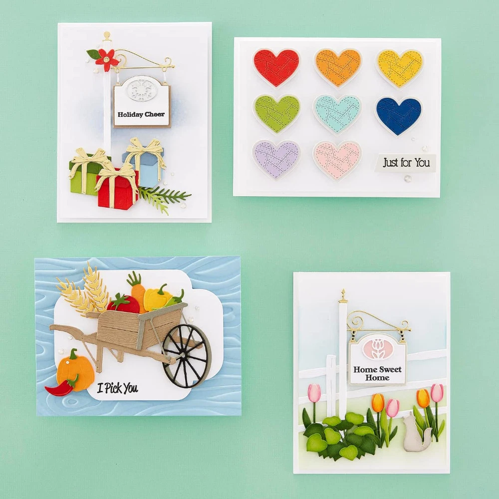 Seasonal Décor Etched Dies are part of the Country Road Collection by Annie Williams. Fill a wheelbarrow with these goodies in this set of 23 thin metal cutting dies! Not only can you load up veggies but sprinkle a few holiday accents in too. Great set to add for all year round! Works well with S4-1279 Country Wheelbarrow. Country Road is Annie Williams’ debut collection with . This offering creates a wonderful rural backdrop. It includes all the details such as a wheelbarrow, florals, wooden signs to even fencing parts, and more. A clear stamp set provides not only a wonderful wood sign but sentiments and images to tie everything together. Bring a part of the countryside into your projects! Approximate Size: Star Base: 0.81 x 0.38 in./2.10 x 1.00 cm Star Layer Panel: 0.44 x 0.85 in./1.11 x 2.16 cm Heart Base: 1.33 x 1.16 in./3.40 x 2.90 cm Heart Patchwork Layer: 1.19 x 1.00 in./3.00 x 2.50 cm Box: 1.10 x 1.12 in./2.80 x 2.80 cm Box Lid: 1.15 x 0.58 in./2.90 x 1.50 cm Box Ribbon: 0.83 x 1.09 in./2.10 x 2.80 cm Two Loop Bow Layer: 0.26 x 1.02 in./0.70 x 2.60 cm Bow Layer with Tails: 0.89 x 1.28 in./2.60 x 3.20 cm Bow Knot: 0.12 x 0.11 in./0.30 x 0.30 cm Easter Egg Base: 1.15 x 1.55 in./2.90 x 3.90 cm Easter Egg Layer: 1.15 x 1.55 in./2.90 x 3.90 cm Log (2 pcs): 1.24 x 0.38 in./3.20 x 1.00 cm Log End (2 pcs): 0.27 x 0.30 in./0.70 x 0.80 cm Shamrock: 1.18 x 1.16 in./3.09 x 3.00 cm Carrot: 0.40 x 1.20 in./1.00 x 3.00 cm Carrot Top: 0.40 x 0.42 in./1.00 x 1.10 cm Bell Pepper: 0.82 x 0.91 in./2.10 x 2.30 cm Bell Pepper Top: 0.33 x 0.27 in./0.80 x 0.70 cm Tomato: 0.91 x 0.72 in./2.30 x 1.80 cm Tomato Top: 0.41 x 0.57 in./1.00 x 1.50 cm Chili Pepper: 0.34 x 0.41 in./0.90 x 1.00 cm Chili Pepper Top: 0.34 x 0.41 in./0.90 x 1.00 cm Pumpkin Leaf: 0.32 x 0.50 in./0.80 x 1.30 cm Pumpkin Vine: 0.45 x 0.93 in./1.10 x 2.40 cm Round Pumpkin: 1.27 x 1.28 in./3.20 x 3.30 cm Round Pumpkin Stem: 0.34 x 0.38 in./0.90 x 1.00 cm Flat Bottom Pumpkin: 1.39 x 1.12 in./3.50 x 2.80 cm Flat Bottom Pumpkin Stem: 0.29 x 0.39 in./0.70 x 1.00 cm Medium Pumpkin: 1.03 x 1.17 in./2.60 x 3.00 cm Medium Pumpkin Stem: 0.28 x 0.30 in./0.70 x 0.80 cm Squash: 0.75 x 1.19 in./1.90 x 3.00 cm Squash Stem: 0.15 x 0.20 in./0.40 x 0.50 cm Seasonal Décor Etched Dies are from the Country Road Collection designed by Annie Williams Fill a wheelbarrow with the goodies in this set of 23 thin metal cutting dies. Not only can you load up veggies, but sprinkle a few holiday accents in too. Great set to add for all year round! ' wafer thin etched dies are designed to cut cardstock, paper, metallic foil and other thin materials and can cut, emboss, and stencil with a single template Designed for the Platinum machines, but compatible in most die cutting machines Various Sizes from 0.09" x 1.43" to 12.11" x 1.34"