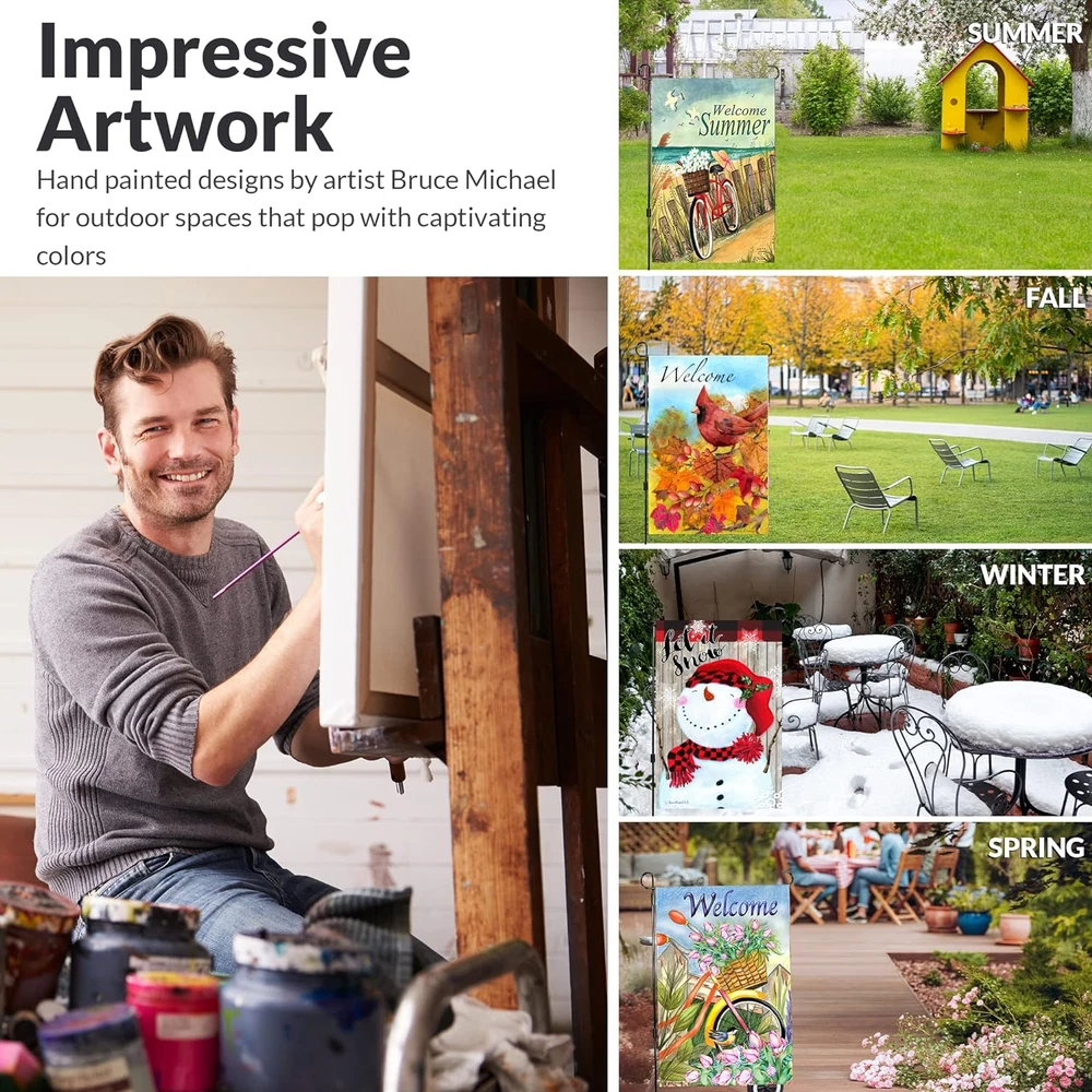 Store New Arrivals Add to Favorite View Feedback Contact Seasonal Garden Flags Set of 10 12X18 Inch Double Sided Yard Flag with Anti-Wind Clip and Stopper Small outside Decorative Holidays Outdoor Lawn Banner Spring Welcome Description Color Clear Product Dimensions 18"L x 12"W Material Polyester Fabric Type Polyester Item Weight 12 ounces Specific Uses For Product Outdoor Recommended Uses For Product Garden Occasion Holiday,Winter Special Feature Double Sided Brand Country Charm Garden Flags Product Care Instructions Hand Wash Only Manufacturer Bruce Michael & Co. Eye-catching garden flags double sided in a convenient 12x18 size, perfect for adding a touch of charm to your outdoor space. Fits most garden flag stands. Celebrate every holiday with our collection of small flags for yard and garden, ensuring your home is always festive and welcoming. Switch out your flags with the changing seasons and hoildays to showcase your style with our selection of seasonal flags for outside. Make your outdoor space come alive with our vibrant holiday flags for outside, designed to bring joy and cheer to your surroundings. Product Description 10 Garden Flags For All Seasons 10 garden flags 12" x 18" double sided designs for year-round celebrations and holidays. This assortment includes Spring, Summer, Fall and Winter. Valentine's Day, St. Patrick's Day, Halloween, Easter, 4th of July and Christmas Garden Flags for Outside EVERY SEASON - If you are looking for a way to brighten up your outdoor space, these garden flags will do the job! With vibrant colors and different seasons, these will be perfect for what you need. Whether you're going for Winter, Spring, Summer or Fall, we've got it all covered. Colorful and vibrant yard flags with a 2" wide sleeve for top of pole to slide easily into most garden flag stands. Seasonal Garden Flags 10 Garden Flags 12" x18" Double Sided 12" x 18" in Sizes Weather Resistant Double Sided with Sun Protection High Quality Material Wind Clip and Stopper 3 Layers Of Material Keeps your holiday garden flags assortment from fading in sunny areas. We use study quality material to hold up in stormy weather conditions with sun protection material for bright and colorful yard banners that can be used for many seasons. Give your garden or backyard a splash of color. Impressive Artwork Your home and garden will look beautiful with charming yard flags that give your house great curb appeal. Our yard banners are unique mini flags that you can enjoy for years to come. Watercolor designs that are bright and colorful give your yard that festive look for every season. Outdoor Garden Flags QUALITY MATERIAL WITH 3 LAYERS - Made of 3 layers, these flags are a durable and stylish choice for your garden. These beautiful lawn flags are perfect for all seasons and holidays. They come with two fabric panels on each side, one being the reverse of the other. The fabric is UV treated to last through many seasons outdoors. BRIGHT AND VIBRANT COLORS - With these beautiful flags, your garden will come to life every season. You'll be able to display a new flag for each season! These flags are durable, UV-resistant and made with vibrant colors that won't fade, so you can enjoy all the seasons without worrying about buying them. Yard Flags Add a splash of vibrant color to your front or backyard with our charming double sided garden flags celebrating all holidays and seasons. Add to Cart Add to Cart Customer Reviews 4.7 out of 5 stars 4,813 4.7 out of 5 stars 1,116 4.7 out of 5 stars 52 Price $21.49 $ 21 . 49 $21.49 $ 21 . 49 — 12 x 18" ✓ ✓ ✓ Double Sided ✓ ✓ ✓ Durable Material ✓ ✓ ✓ Weather Resistant ✓ ✓ ✓ Hand Painted Designs ✓ ✓ ✓ ABOUT US We offer the best prices around on high quality products. Our E-store includes media such as books, movies, music and games while offering electronics, toys, sporting apparel, clothing, tools, general home, garden items and more. SHIPPING We are always working hard to ensure your package arrives as soon as possible. Please understand that some factors like weather, high postal traffic, and the performance of shipping companies are outside of our control. We offer free shipping to the lower 48 states and ship within 2 business days of payment, usually sooner. We do not accept P.O. Boxes. Please provide a physical address. RETURNS We offer a 30-Day Return Policy on items which you are not completely satisfied with. You have the option for a full-refund or an exchange of the item. No returns are available on items shipped outside of the USA. PAYMENT We accept PayPal. CONTACT US This page content is yet to come Please ad us to your favorite seller and visit again later Thank You CUSTOMER SATISFACTION We try our very best to make sure every customer is completely satisfied. If there's a problem, message us! We're happy to help.