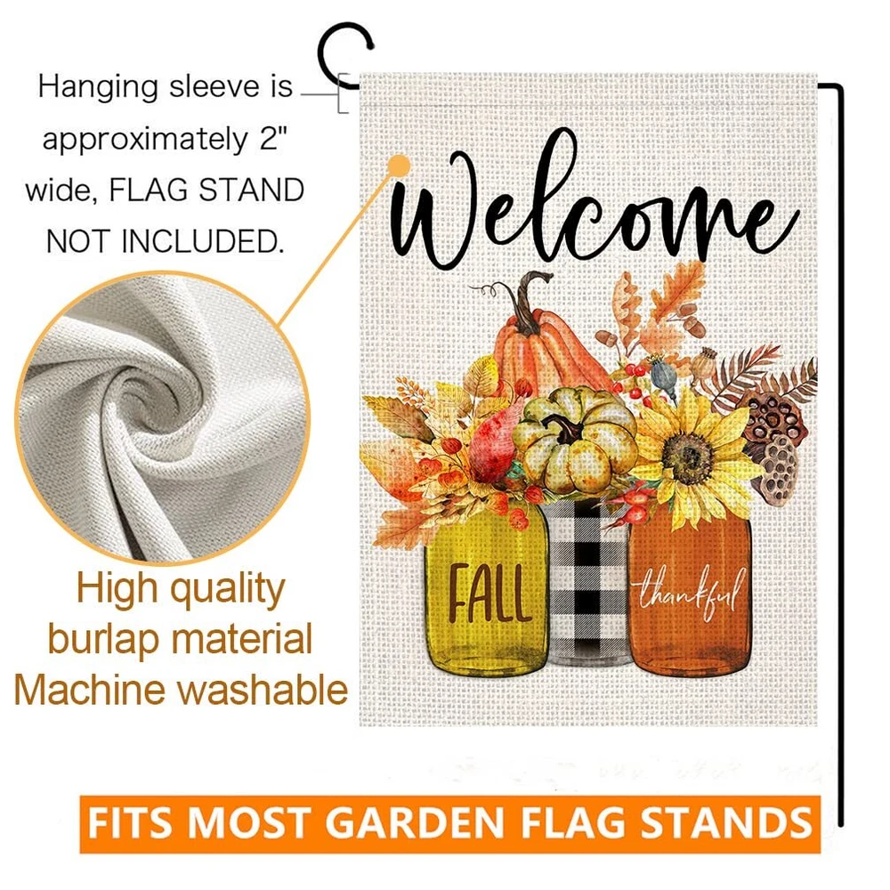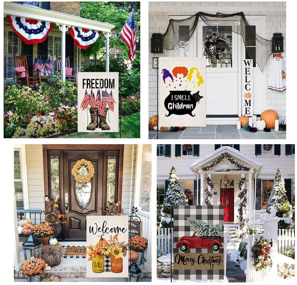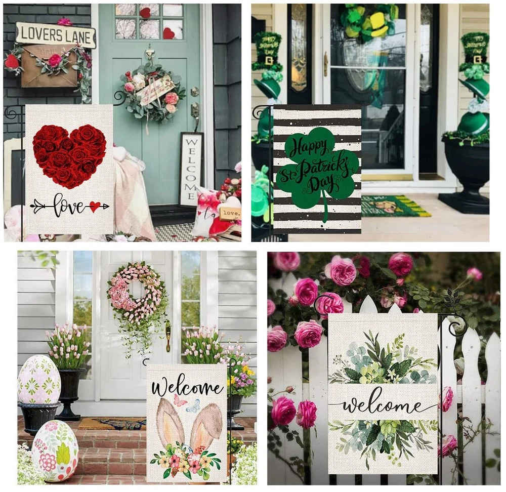 1. Super Value: 10 Pack garden flags for every important holiday, season and family occasion, 100% burlap material, higher quality, durable, weather and fade resistant, keep the flags flying for a whole year. Great gifts for your family and friends. 2. Double Sided: Double side with vibrant, colorful and adorable pattern, both sides are readable. 3. Easy to Install: These yard flags are 12.5 x 18 inch, with about 2 inch opening, and fit all standard sized garden flag pole stand (stand not included), packed in a zipper storage bag, easy to . 4. Super Useful: Dress up your home yard, lawn or garden with these beautiful outdoor garden flags, celebrate with your loved ones, and be the envy of the neighborhood. 5. Premium Quality Printing: of the best parts about our outdoor seasonal flags designs is how bright and cheerful each and every print is. Bright up your outdoor space with our Premium Double-Sided Garden Flags. Personalize your adorable garden with these unique designed seasonal flags.