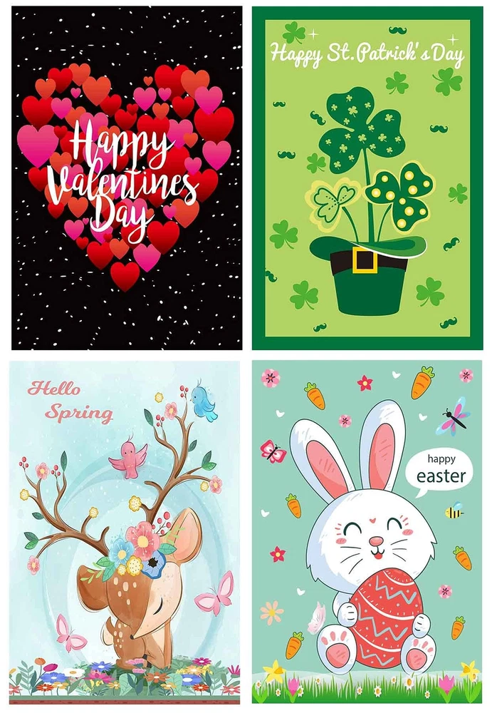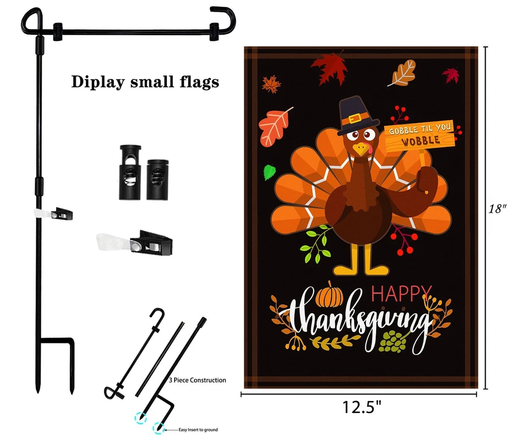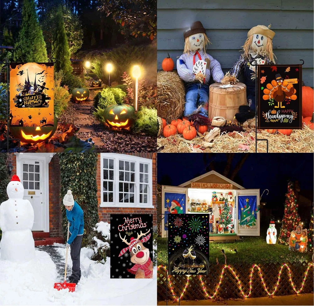 Seasonal Garden Flags Set of 12 and Garden Flag Stand-Holder-Pole Double Sided Burlap 12.5 x 18 Inch Fall House Flags Garden Flags for Outside Fall Garden Flags Halloween Garden Flags Thanksgiving Feature 1- Our outdoor flags decorative 12.5x18 are exquisitely designed, lively and beautifully patterned. It is the best choice for decorating backyard, lawn, garden, deck, patio, porch or balcony. 2- Made of high-density double-layer Burlap garden flag thanksgiving, it is durable. 3- Using advanced double-sided printing technology, both sides of the pattern are clearly visible. Make your holiday garden flags more attractive. 4- Easy to Install:The garden flagpole is easy to install, only needs to tighten the three parts to each other, and is easy to operate without tools. The bottom of the flagpole is machined and easily inserted into the ground without damaging the environment. 5- Show life, highlight the festive atmosphere. For example, our garden sign holder and season flags suitable for New Year's Day flag, Lincoln's Birthday flag, St. Valentine's Day flag, Washington's Birthday flag, St. Patrick's Day flag, April Fool's Day flag, Easter flag, Arbor Day, Mother's Day flag, Memorial Day flag, Flag Day, Father's Day, Independence Day flag, Labor Day, Veteran's Day flag, Halloween flag, Thanksgiving Day flag, Christmas flag ect. 6- The accessories are complete, you can use it when you buy.Rugged and durable flagpole with flag stoppers and Anti-Wind Clips,all garden flag holiday set. Buy and use, let your beloved flag float in your garden forever Information: Size: 12.5*18 Inch Cuff diameter: 1.8 inches Material: 100% Burlap Printing: double-sided Packing include: garden flag stand x 1 garden flags for all seasons x 12 Anti-Wind Clips x 1 Garden flag Stoppers x 2 Quickly join the shopping cart and enjoy the joy of all holiday. MORE BENEFITS Garden flag with stand included - Decorate your garden with outside flag holder and decorative flags for outside 12.5 x18:St. Patricks Garden Flag, Easter Garden Flag, 4th of July Garden Flag, Halloween Garden Flag, Thanksgiving Garden Flag, Christmas Garden Flag, valentine's day Garden Flag, Spring garden Flag, Autumn garden Flag,Winter garden Flag,New years flags to fill your garden with the joy of all Seasons and Holidays High quality lawn flag stand & holiday yard flags - Made of rust-proof black metal, not easy to bend.Made from high-density and double thickness Burlap,durability mini garden flags Double-sided 2 layer garden flags for all seasons - outdoor flags decorative 12.5 x 18,top with cuffs for outdoor garden flag holder Application scenario - outdoor garden flag holder and holiday garden flags assortment sets can be used in any backyard, lawn, garden, deck, patio, porch or balcony to add joy to your all holidays Enjoy a pleasant shopping experience.if you are not satisfied with the product,please contact us promptly and we will give you a satisfactory response.join your shopping cart to celebrate your all festival