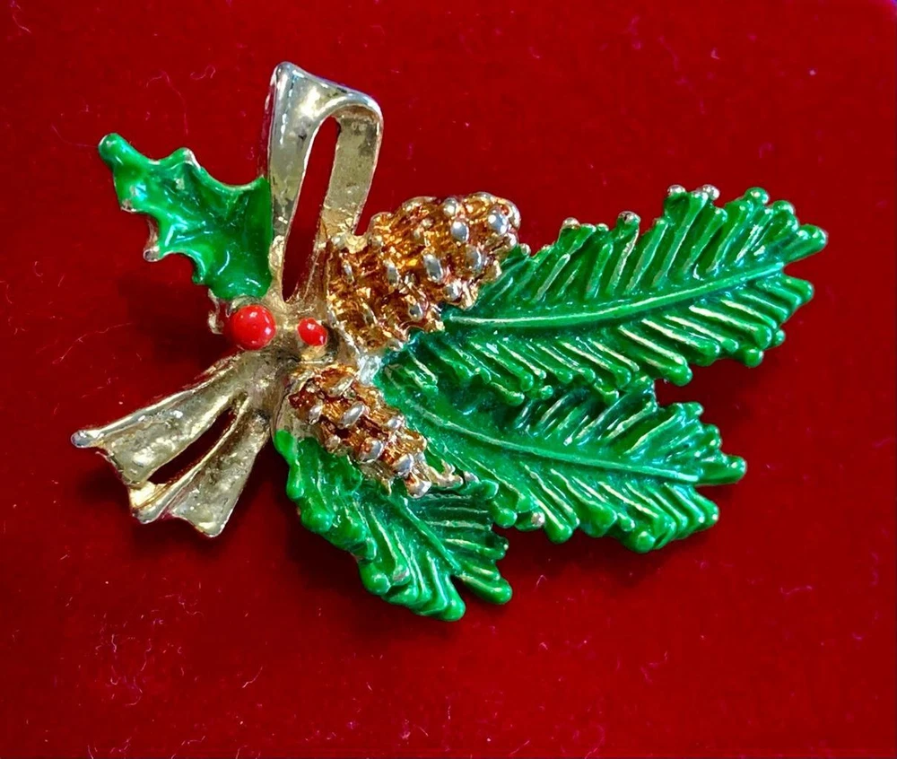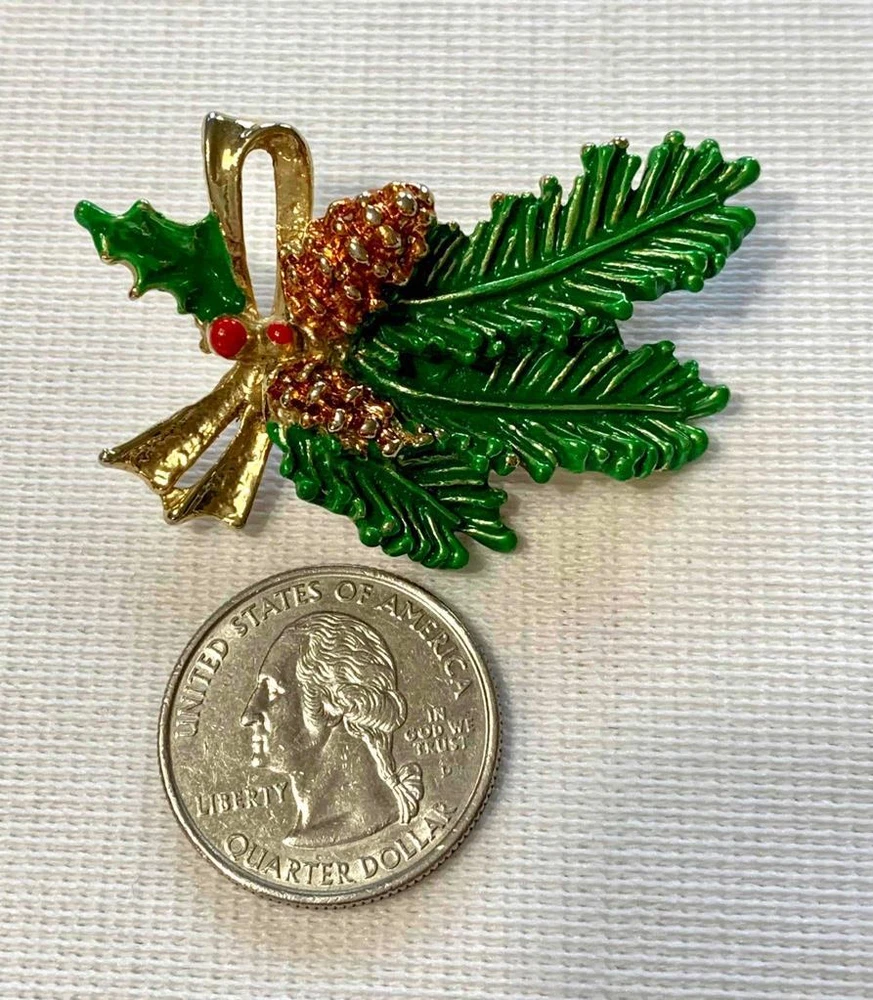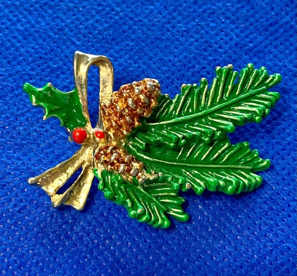Nicely decorated gold tone pine and holly Christmas Pin Brooch. It is enamel decorated with green pine, amber cones, green holly leaves and red berries all tied with a gold tone ribbon. Marked Taiwan. It measures about 2" tall by 1-3/8" long. Please examine the attached photos, they describe this listing better than any words. Click on any photo to 'super size' them. We'll be happy to answer any questions. We will wrap securely and mail it in a shipping box. Seasonal Gold Tone Christmas Pine & Holly Enamel Decorated Pin Brooch Seasonal Gold Tone Christmas Pine & Holly Enamel Decorated Pin Brooch Click images to enlarge Description Nicely decorated gold tone pine and holly Christmas Pin Brooch. It is enamel decorated with green pine, amber cones, green holly leaves and red berries all tied with a gold tone ribbon. Marked Taiwan. It measures about 2" tall by 1-3/8" long. Please examine the attached photos, they describe this listing better than any words . C lick on any photo to 'super size' them. We'll be happy to answer any questions. We will wrap securely and mail it in a shipping box. RC 4 Black Hills Gold 12/1/22 Payment eBayPay accepts many forms of payment, including PayPal. COMBINED SHIPPING - please place items in eBay's shopping cart. When you are done shopping in our store, click on the cart and Request an Invoice. For jewelry items, you pay shipping on one item, plus 25¢ shipping for each additional item. Payment is expected within 4 days of the sale. If you need additional time to pay, we will be happy to work with you IF YOU CONTACT US. If you do not contact us, the item will be reported to eBay as unpaid. Sales Tax: if your state has a law requiring sales tax be paid on items purchased on the internet, eBay will add that tax to your total purchase price. *** International Buyers ~ Please Note: Import duties, taxes and charges are not included in the item price or shipping charges. These charges are the buyer's responsibility. Please check with your country's customs office to determine what these additional costs will be prior to bidding/buying. These charges are normally collected by the delivering freight (shipping) company or when you pick the item up - do not confuse them for additional shipping charges. We do not mark merchandise values below value or mark items as "gifts" and will not send items prohibited by your country's import laws. US and International government regulations prohibit such behavior. Please DO NOT ASK us to lie. Shipping SHIPPING TIME: Jewelry is shipped next business day. Larger items within 3 business days. If you need an item sooner, please let us know and we will expedite shipping. SHIPPING CHARGE: When we use eBay's Calculated Shipping, we determine the box size and weight and add shipping insurance, then eBay calculates the cost to ship. Smaller items are shipped at a flat rate, shown on the listing. We try to price our items below value to allow for shipping charges. Our guarantee to you: We will package your item to shipping industry standards so it will have the best possible chance of reaching you safely. As you can see from our feedback, we put our customer's satisfaction first . We work hard to gain a 5-star rating. If we have failed to meet this goal, PLEASE contact us and give us the opportunity to add you to our "Totally Satisfied" customer list. Terms of Sale Please note that our photos are part of our description and that vintage or pre-owned items will usually have some signs of wear. Please ask if you have questions about any item. We will accept returns for the following reasons: On items listed as ACCEPT RETURNS - Changed mind, Doesn't fit, Don't like it, Color is not what I expected On ALL items under "eBay guarantee" policy - Wrong item sent, Not as described, Arrived broken, etc. Please contact us within 4 days of receipt of the item if you intend to return it. Items being returned must be mailed back no later than 30 days from date of sale. Item must be in ORIGINAL CONDITION with no alterations or damage received while in your possession. Securely wrap items along with any display or presentation boxes, using bubble wrap, and place them in the original box or a sturdy substitute for mailing. If the listing shows we pay return shipping, eBay will ask us to send you a return mailing label and will notify you where to find it for printing. If the listing shows you pay for return shipping, we provide you with our mailing address through eBay. All items are under eBay guarantee and if they are not as described or we mailed the wrong item, we pay the shipping both ways. (Please note that buyers are responsible for reading descriptions and looking at photos. If the item is not as expected because you did not look at the entire listing, it may be returned, but you pay the postage.) Refunds will be made through eBay's Payment system, to the account, card or service that you used in the purchase. Please contact us if you feel an item was not as advertised so we can turn a negative situation into a positive solution. WE DO NOT ACCEPT RETURNS ON CLOTHING or Soft Goods . About Us This husband and wife team have been selling on eBay since 2006. We live in the Ohio Valley where many of the best glass houses of the 1900's were located and sold vintage elegant glassware for many years. We currently offer vintage and other nice jewelry, along with collectibles and assorted other items. We find many treasures at local estate auctions and pass them on to you, our buyer. We are continually learning about vintage jewelry, glass, china and other collectible items and we appreciate your comments and questions. Contact Us Please contact us through E-Bay's link "Ask seller a question". If you have a question about an item, please ask before the last day of the auction so we have time to respond. When inquiring about an item that is no longer listed, please give us a description or title for the item. Thank you for looking! Images sell! Get Supersize