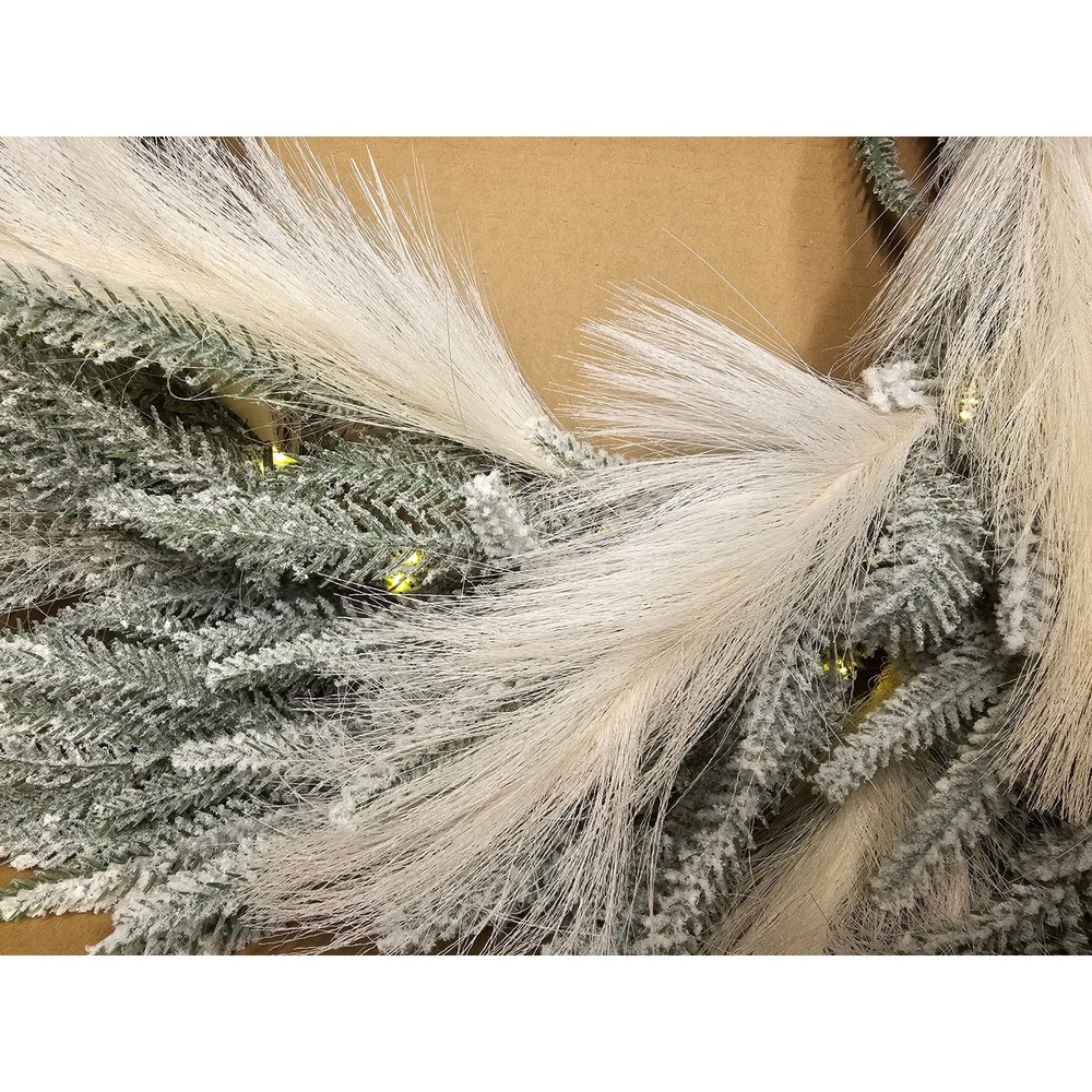 Seasonal LLC 26" Christmas Pine And Pampas Wreath (Retail value $89.99) - 26 inch diameter, snow dusted for a winter look and feel, pre-strung with 50 warm white LED lights, battery operated with 6 hours on/18 off timer, 400 branch tips. For use indoor or covered outdoor location. LED lights are energy efficient and long lasting. Fire resistant and non allergenic. Requires 3 AA batteries (not included). The snow dusted Christmas Pine and Pampas Wreath has a soft and unique appearance. Branches are pre-strung with 50 warm white LED lights that are energy efficient and long lasting. Wreath is battery operated and includes 6 hours on/18 hours off timed operation. Can be displayed on a door, wall or window in indoor or covered outdoor setting. *****Free Shipping - This item comes packed in original manufacturer packaging for shipping and requires time to properly arrange, adjust and spread apart to the desired shape and volume. Branches may need to be separated and will require around an hour of adjustments after shipping. ***** Shop with confidence—my products are carefully inspected and packaged to ensure quality. Fast, reliable shipping within 24 hours and I am available to assist you with any questions. Every purchase helps me continue to provide great products at unbeatable value—thank you for supporting my small business!