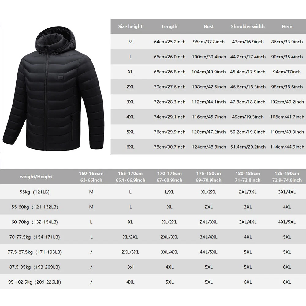 11/15 Areas Electric Heating Jackets USB Charge Thermal Coat for Skiing Camping Note: Slim Style Heating Coat,please choose one bigger size when you choose as our size chart as you also need to wear some inner clothes!! Features: *1. 11 Heating Zones and 3 Temperature Adjustment: Carbon fiber heating elements generate heat across the waist, belly, and back, promote blood circulation and keep you warm. 3 heating temperature adjustment according to your needs. *2. USB Charging: Easy to charge. You need to always connect 5V 2A mobile power(this product does not include mobile power). The mobile power needs to be removed during washing. *3. Safe and Healthy: The 5V far infrared heating is far below the human body safety voltage. Large area carbon fiber wire heater is safe and insulated, ensure safe heating for you. *4. Skin-friendly and Comfortable: Soft and comfortable touch, premium fabrics, keep you warm in cold winter conditions without wearing thick clothes. *5. Wide Application: Suitable for outdoor skiing, winter fishing, cycling, camping, skating, or daily wear, etc. Description: *1. Size: M/L/XL/XXL/3XL/4XL/5XL/6XL *2. Material: Lining: Polyester Fabric: Nylon 100% cotton *3. Temperature Adjustment: Warm: 55 ℃ (Red Light) Comfort: 45 ℃ (White Light) Energy Saving: 35 ℃ (Blue Light) Instructions: *1. Take out the USB plug. *2. Access to the mobile charging power source. *3. Press and hold the chest temperature control output switch for 3 seconds. *4. Long press the chest temperature control switch for 3 seconds, start to warm up and then adjust to the medium temperature heat when you need to always connect the mobile power. *5. Manual adjustment to the third gear,warm temperature of 45 degrees Celsius, comfortable gear temperature of 35 degrees Celsius, energy-saving gear temperature of 25 degrees Celsius. *6. Press and hold the chest temperature control switch for 3 seconds, and turn off the light to stop heating. Washing Tips: - Machine wash & hand wash are available. Do not wring or twists. - Unplug the powers before washing and make sure it is dried before heating. Package List: 1* Heated Jacket(not include power bank)