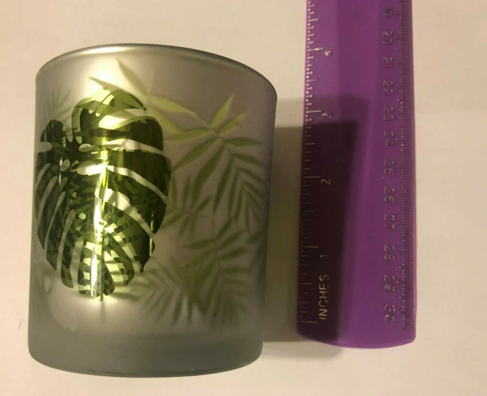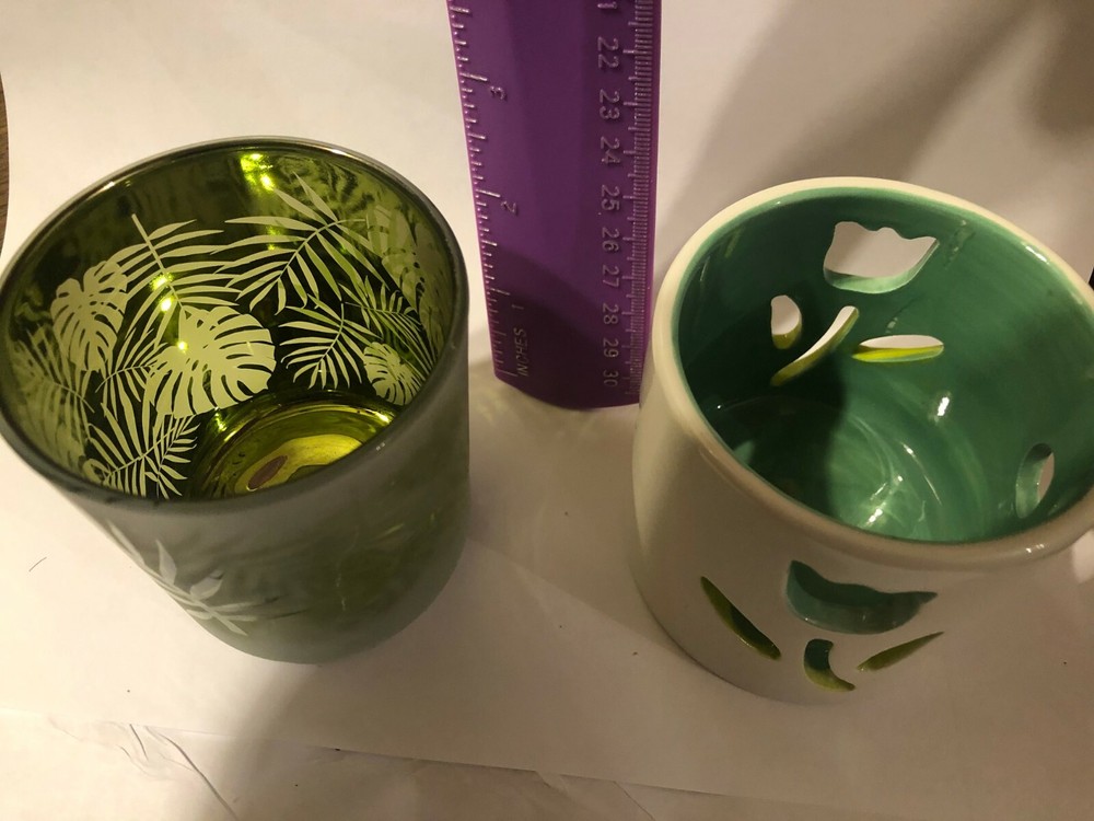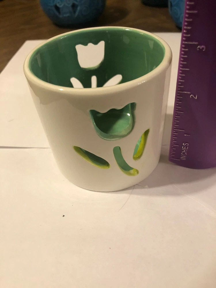 Season Scent Candle Holder. Your choice of ceramic flower or glass with leaves on it. The ceramic one measures about 2.75" in height and the diameter of the opening at the top measures about 2.5". The glass one measures about 3' in height and the the diameter of the opening is about 2.5".