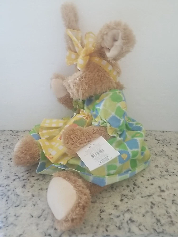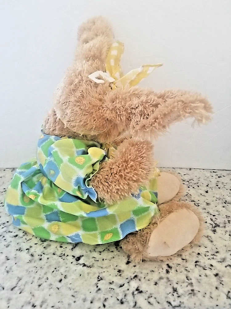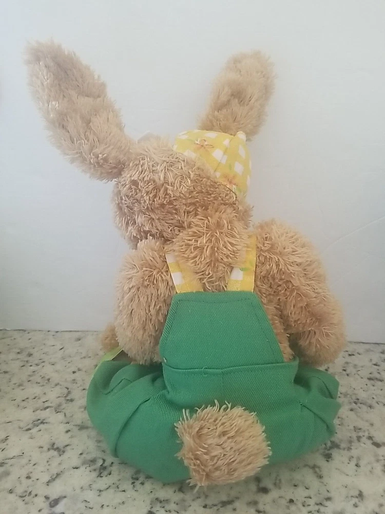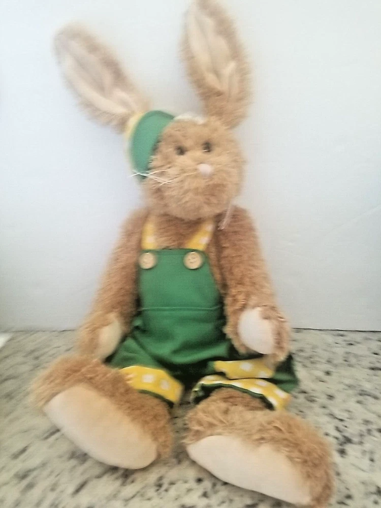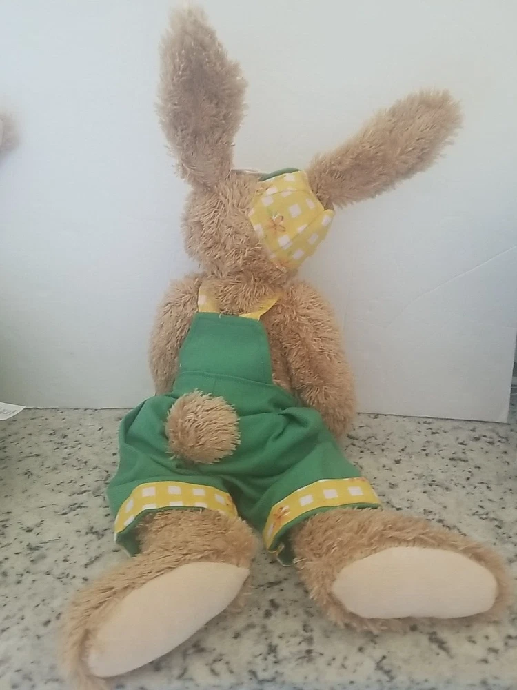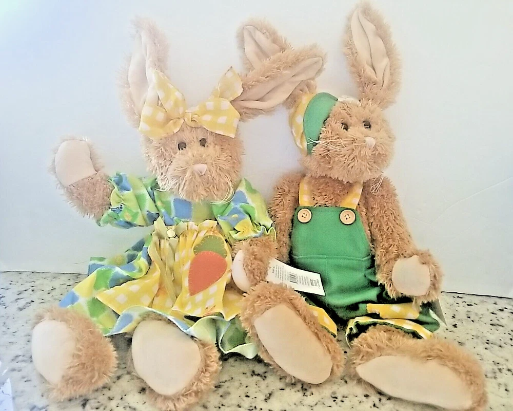 Celebrate Easter with these adorable plush cottontail bunny rabbits. This couple includes a boy and girl rabbit, both are dressed. She is wearing a dress with a coordinating headband and he is wearing green overalls, perfect for popping into an Easter Basket, they will be the main event. Great for cuddling or displaying on a shelf or sitting on a bed or anywhere you want a pop of Easter Color. Get into the spirit of the season with these Seasonal Sensations Cottontail Easter Bunny Rabbit Plush Stuffed Animals. About 22 inches to the tips of their ears New