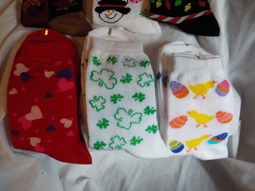 Seasonal Socks VP 6(6) Set of 6 (Autumn, Snowman, Christmas Lights, Valentine's Day Hearts, Easter Eggs/Duck & St.Patrick's Day Cloves). Brand new, never been worn. Set will not be broken up.