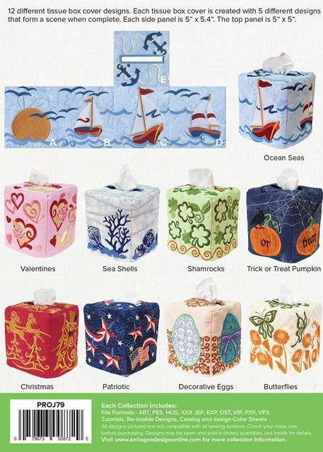 gtin13: 079673008729 UPC: 079673008729 Model: Seasonal Tissue Box Covers Brand: Anita Goodesign Formats: ART, PES, HUS, XXX, JEF, EXP, DST, VIP, PXF, VP3 Hoop Size: 5” x 7” to 9.5” x 14” Country/Region of Manufacture: United States MPN: PROJ79