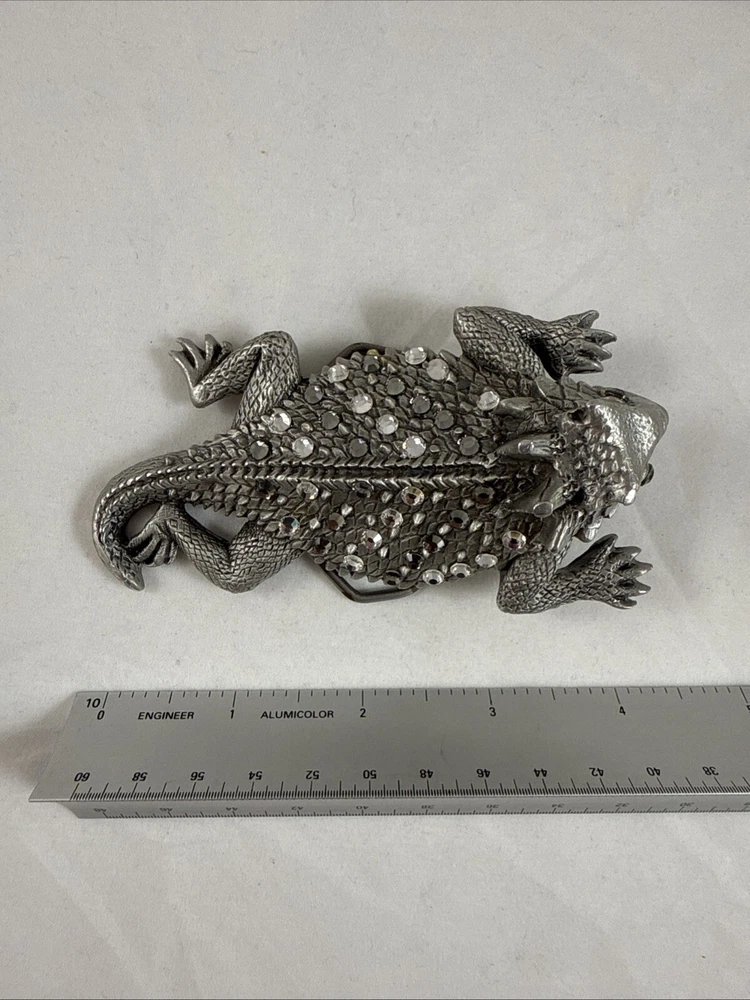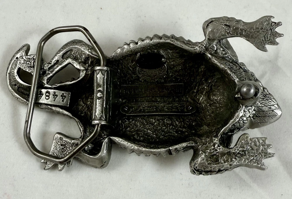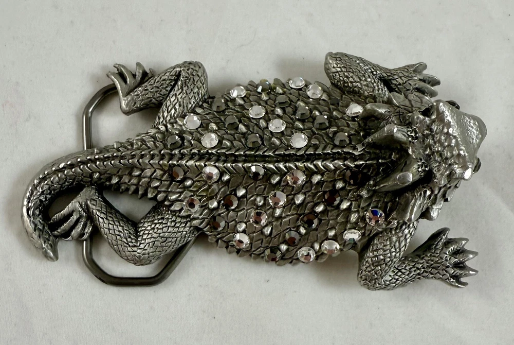 Add a touch of uniqueness to your wardrobe with this Seasonal Whispers #4484 Horned Lizzard belt Buckle. The intricately designed buckle is perfect for those who love to make a statement with their fashion choices. Made by a trusted brand, this buckle is sure to last for years to come. This versatile buckle can be paired with any outfit, making it a must-have accessory for any fashion-forward individual. Whether you're dressing up for a night out or looking to add some flair to your everyday look, this buckle is the perfect choice. Seasonal Whispers Belt Buckle in great shape!