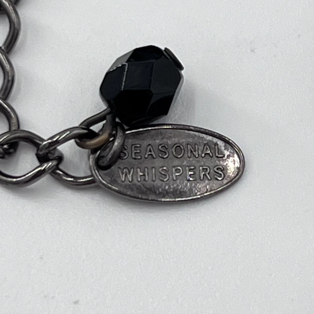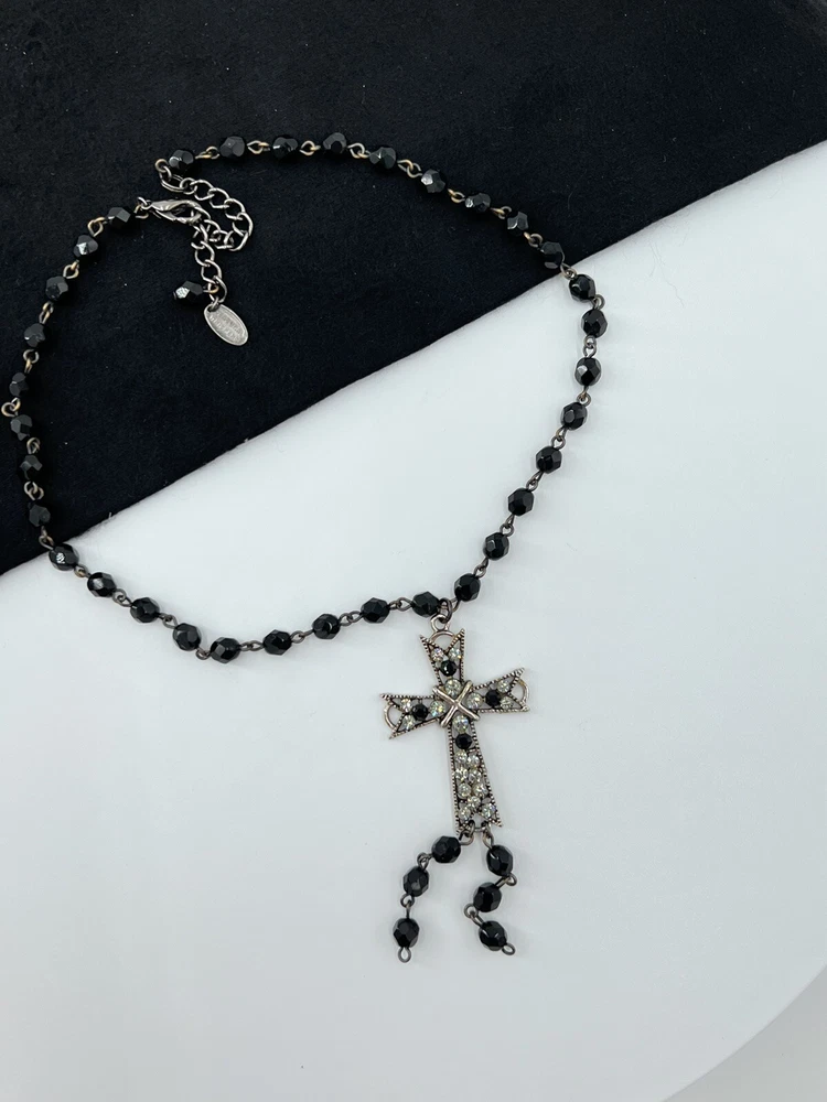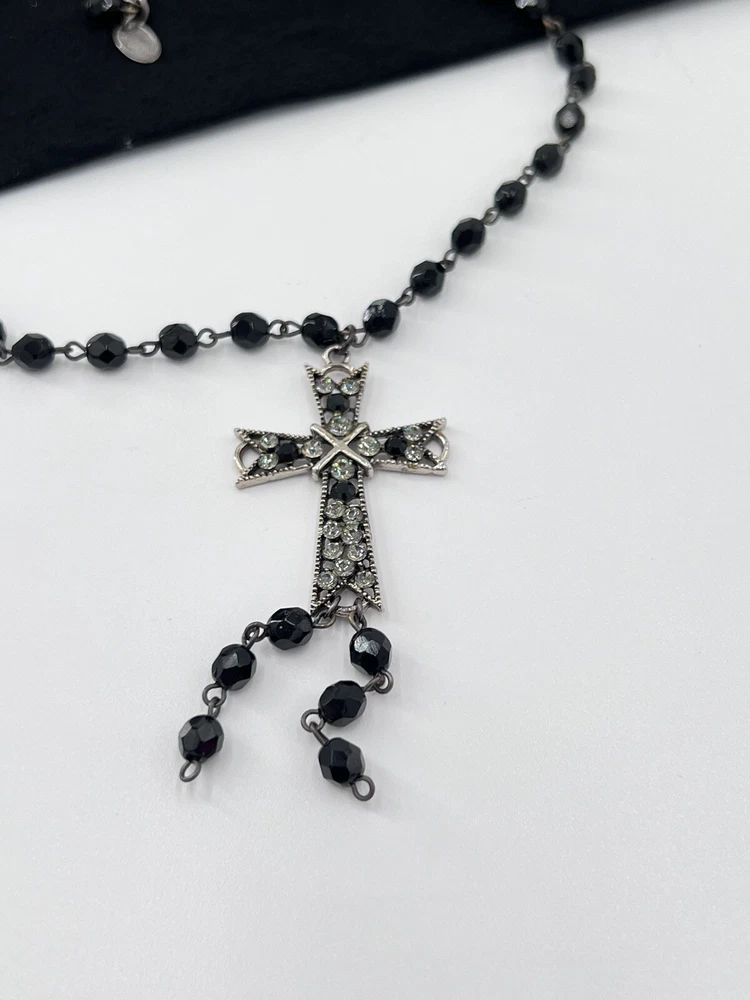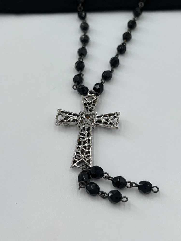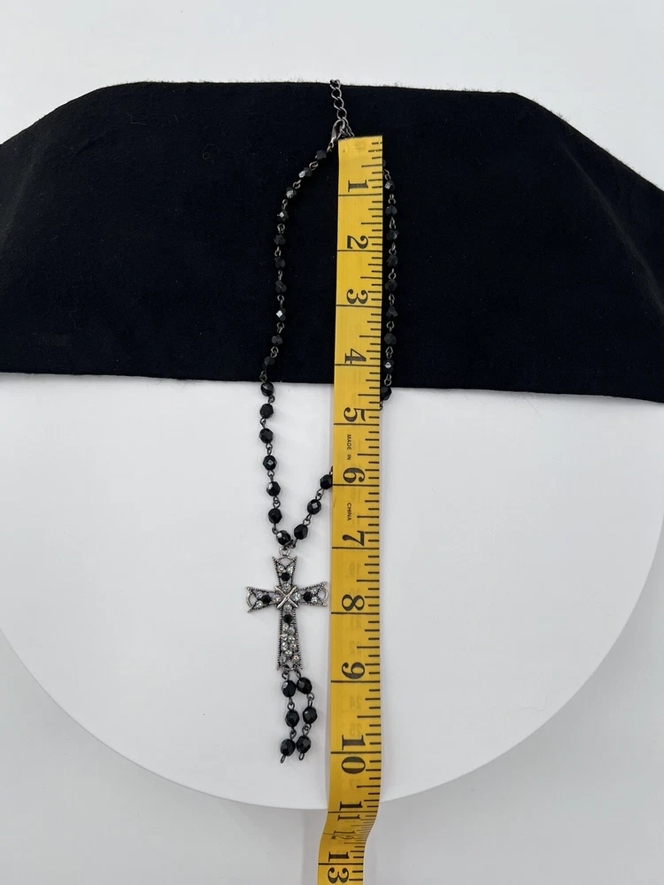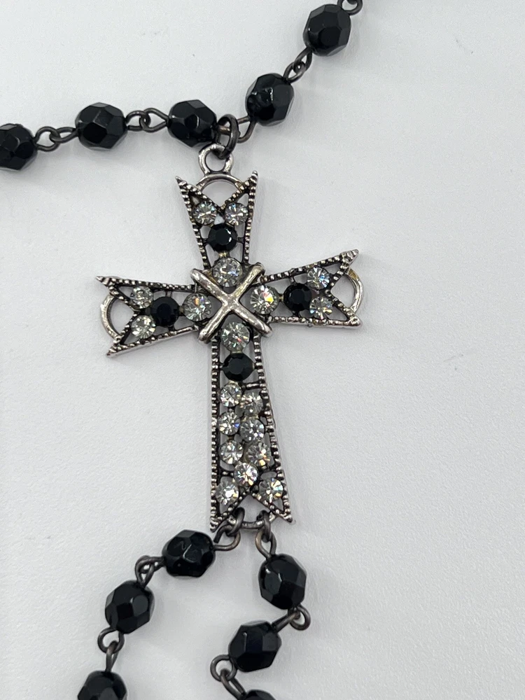 Black faceted beads and a silver cross accented with black rhinestones and clear rhinestones create an inspirational religious piece. See photo for measurements.