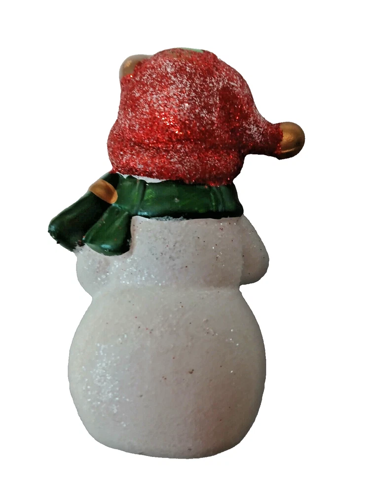 Add a festive touch to your Christmas decor with this charming seasonal snowman figurine. Crafted from ceramic with a glossy finish, this original piece features a red sparkle hat and green scarf, making it a perfect addition to your holiday collection. Measuring 5 inches in length and weighing 3.7 inches, this figurine is ideal for display on a shelf or tabletop. The snowman subject and seasonal theme make it a great decoration for any winter occasion. This Smiling Snowman brand figurine is a must-have for any collector or fan of holiday decor.