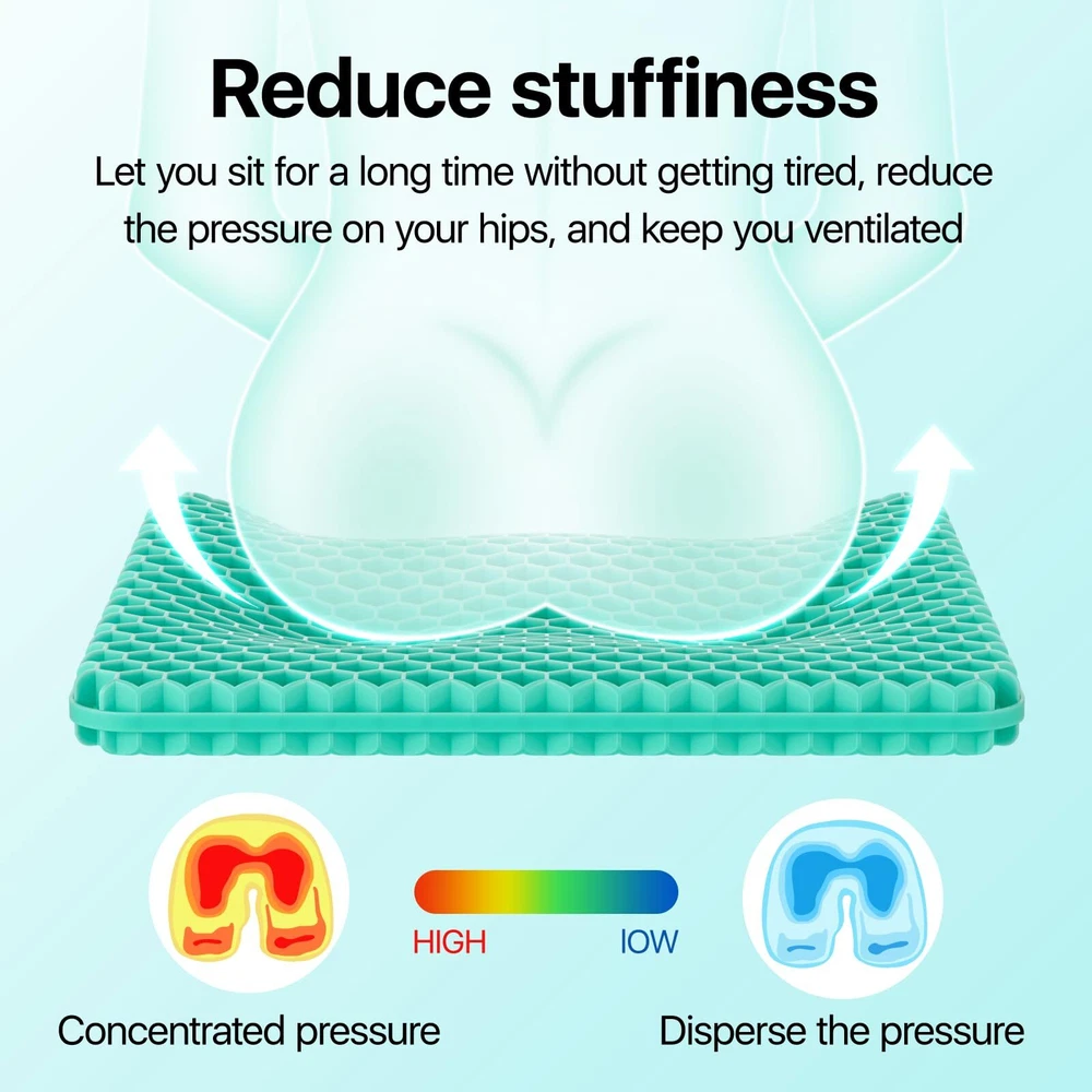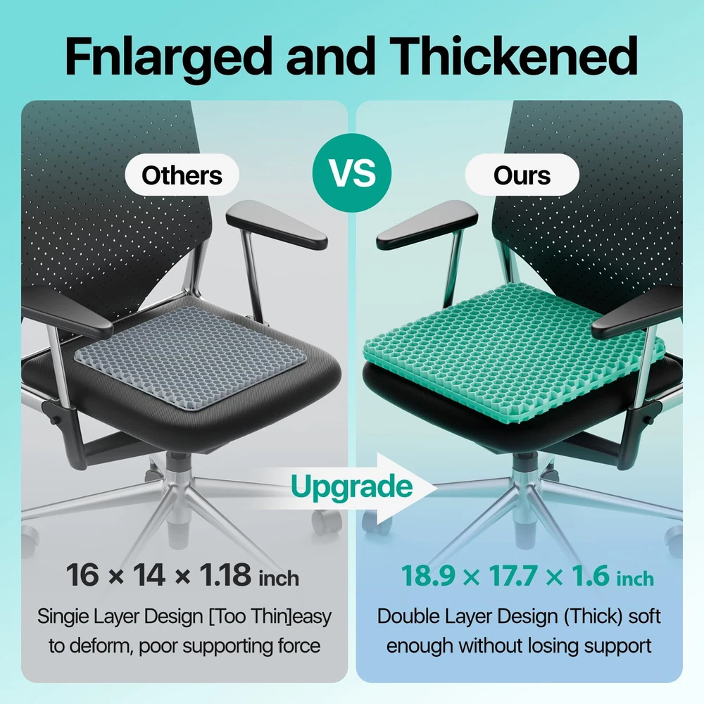 【Large size & Help Relieve Pain】seat cushion size is 18.9 x 17.7 x 1.6 inch, weight about 2.6lb.Double-layer cushion design. Not only thicker, but also more comfortable effectively prevent and alleviate various pain symptoms, including tailbone problems, lumbar strain, sciatica, and degenerative disc disease. 【Breathability and heat dissipation】Our seat cushion adopt a honeycomb design, and the built-in free-flowing air channel prevents the seat from sweating and maintains comfortable heat dissipation. 【Super soft & hard to deform】The cushion has cushioning property that it does not break even if you put an egg and sit down. In addition, it is characterized by highly elastic material, it restores to its original shape as soon as it is stretched and squeezed and has superior durability than a conventional cushion. 【Applicable scope】Chair pad is great for office, home, travel, car seat, or wheelchair use, suitable as gifts for family, friends, and colleagues. 【Zipper design, easy to clean】The zipper design and detachable seat cover can better clean the seat cushion. This way you can use the seat cushion without worrying about soiling the seat.