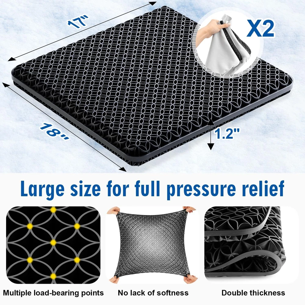 18"L x 17"W Large size decompression: The pressure relief seat cushion can fit the user's body curve, evenly disperse the body's pressure, and relieve back pain, sciatic nerve tension, thigh paralysis and other problems. Whether it is office, driving or outdoor activities, it can bring excellent support experience. Strong durability: The gel material itself has excellent durability and wear resistance, and has a long service life. High-quality material, adults, children and pregnant women can use it with confidence. Very good as seat cushions for office chairs, seat cushion for car, and wheelchair cushions, etc. Perfect support: The design is lighter than its peers without losing excellent support, bringing you a different decompression effect. Depends on the unique structure of the seat cushion, there are more support points and better support. I believe it will become chair cushions that sedentary people and obese people will fall in love with. Perfect support: The design is lighter than its peers without losing excellent support, bringing you a different decompression effect. Depends on the unique structure of the seat cushion, there are more support points and better support. I believe it will become chair cushions that sedentary people and obese people will fall in love with. Thoughtful gift: The comfortable and breathable chair cushion is a thoughtful choice for your loved ones, friends, and family to relieve fatigue from long hours of work. There are 2 years of free product service. If you have any problems with the product, you can contact us at any time to solve it.