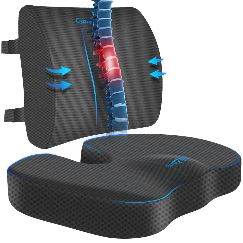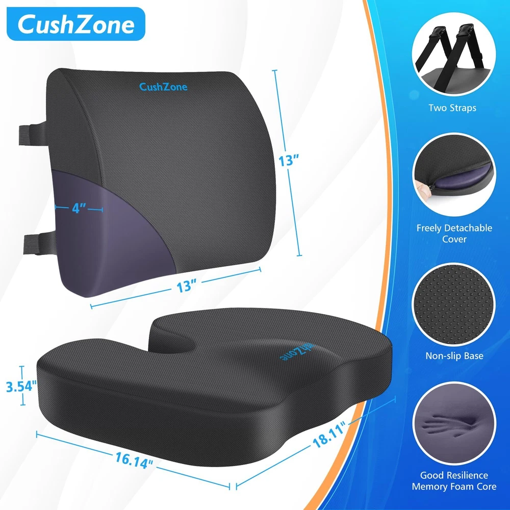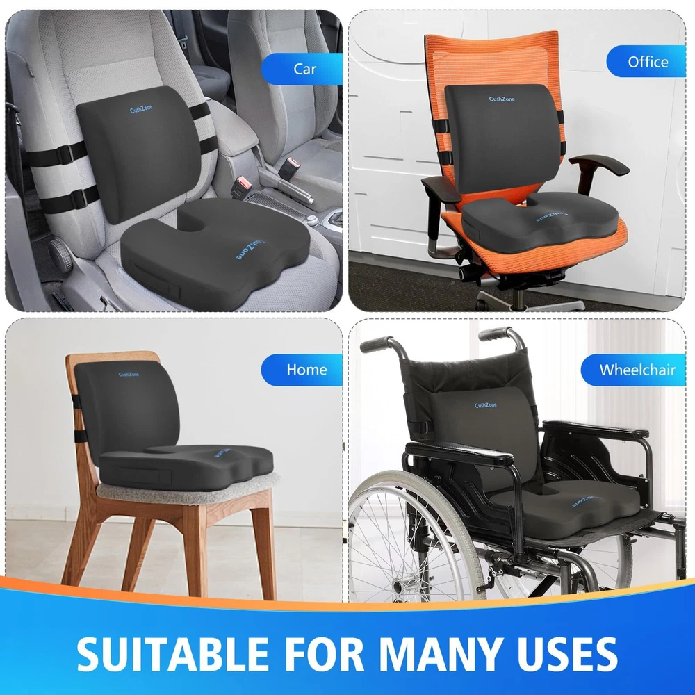 Enhanced Seat Cushion, Lumbar Support Pillow with Adjustable Strap-Chair Cushions for Sciatica Pain Relief-with Washable Cover for Car, Travel and Wheelchair, Grey, X-Large 【Comfortable Sitting】The dimensions of the chair cushion are 18.11" x 16.14" x 3.54" and the dimensions of the lumbar support pillow are 13”x 4”x 13”. The size meets the needs of most people, and the shape of the product is ergonomically designed to effectively relieve the discomfort caused by sitting in one place for extended periods of time. 【Thoughtful Detailing】Our seat cushions and lumbar support pillows are made of high quality fabric with quality zippers. The bottom of the seat cushion has a special non-slip design and the back of the lumbar support pillow is installed with adjustable straps to fit chairs of various sizes. 【Convenient to Use】The cover of the seat cushion and lumbar support pillow is removable and made of machine washable fabric for easy cleaning. The carrying handle on the seat cushion makes it easy to carry. 【High-quality Materials】The core of the seat cushion and lumbar support pillow is made of high-quality foam, which is both soft and supportive and not easily dented. Soft memory foam gently conforms to your body. 【Suitable for Work and Home】Great present for anyone who sits for long periods of time. This product can be used at home, as an office chair cushion, or as car seat cushion, and also for people who often sit in wheelchairs.
