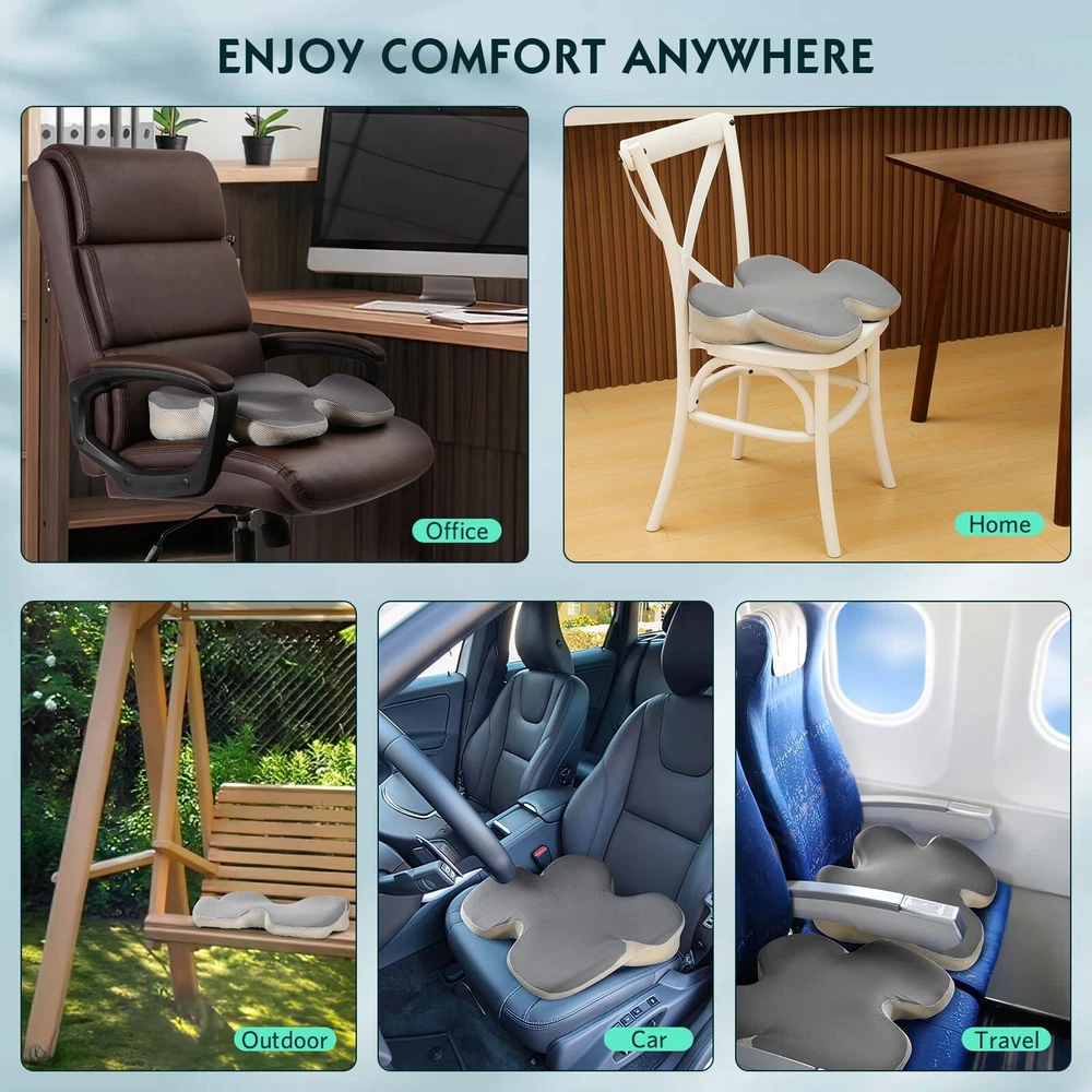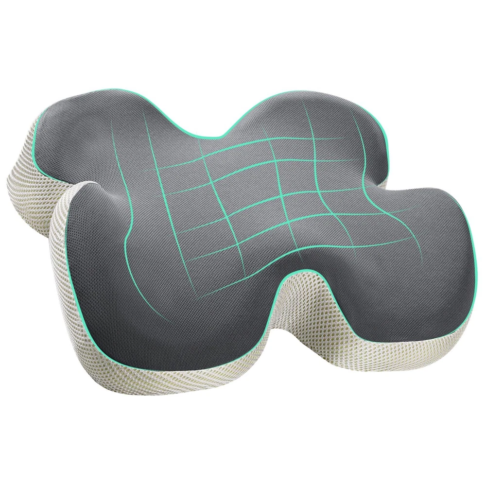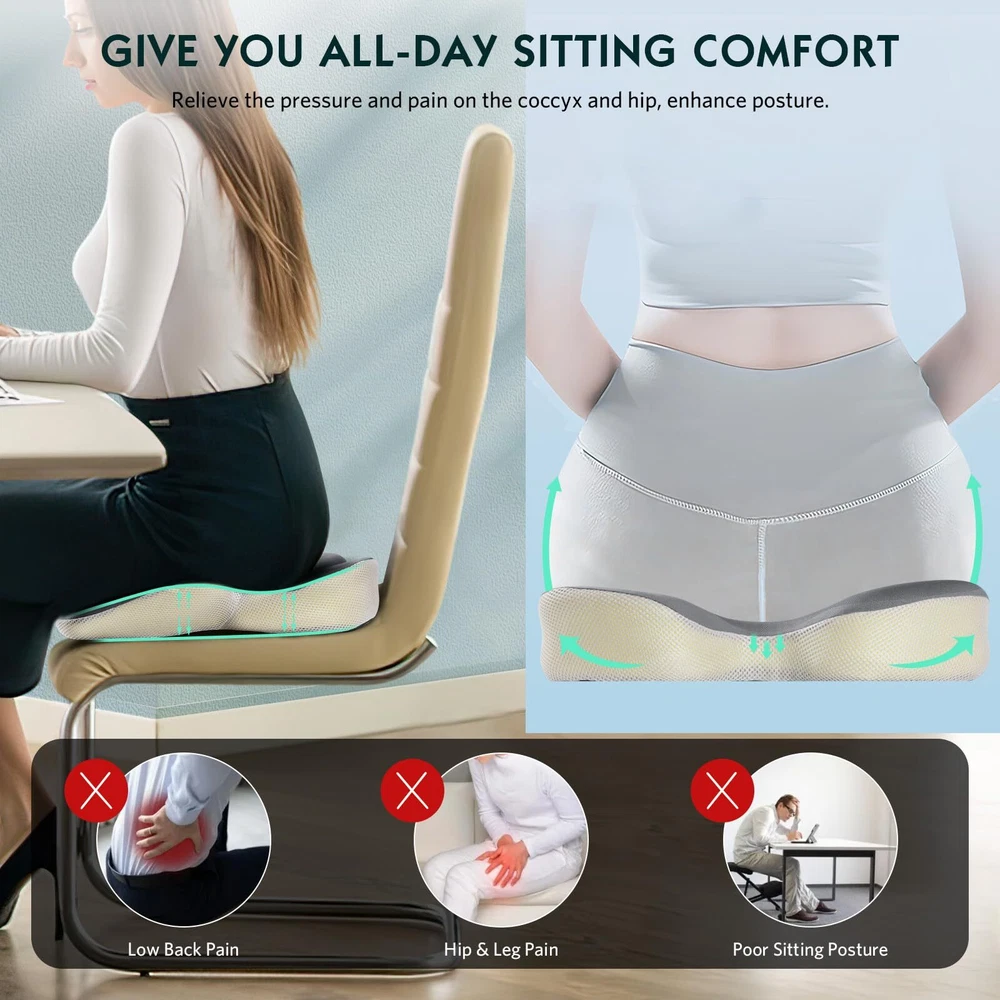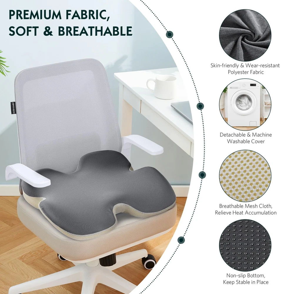 【Our Cushion Designed for U】patented contoured double "U" cut-out memory foam seat cushion is ergonomically designed to accommodate your body curve, keeps hips and tailbone away from hard sitting surfaces to release pressure on your lower body. Provides effective hip, leg, thigh support for all-day sitting comfort, improves sitting posture, and helps reduce tailbone, coccyx, sciatic pain 【Premium Material】Our sciatica pain relief pillow adopts molded slow rebound memory foam that is helpful for distributing your weight evenly; Includes a detachable and machine washable cover that is made of skin-friendly and wear-resistant polyester fabric on top, breathable mesh on the sides, and black anti-skid fabric bottom to ensure the cushion keeps stable in a seat 【Enjoy Comfort Anywhere】 Measures 18.5" x 15.5" x 4.0", our tailbone pressure relief seat cushion fits most chairs, and can be used as chair cushions for office desks, computer and gaming chairs, dining chairs, or car, truck, train, airplane, travel, stadium, bleacher, wheelchairs seat cushions, etc. It's a chair pad that suits everyone, including office workers, long-time drivers, pregnant women, teachers, students, the elderly, people need wheelchair, etc 【Ideal Gift for The One】Our pressure relief seat cushion is an ideal gift for the elderly, families, partners, teachers, or friends on Birthday, Mother's Day, Father's Day, Valentine's Day, Thanksgiving Day, Christmas Day, Housewarming gift, etc 【After-Sales Service】If you have any questions about the office chair cushions, please feel free to contact us; You can also search "memory foam lumbar pillow" in the store to find the matching back support; [WARM TIPs]: For your health, please take 5-10 minutes to get up and move after 1 hour of continuous work