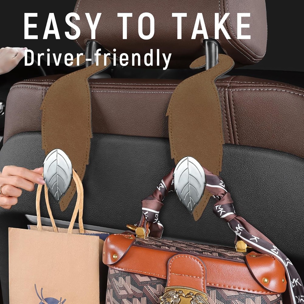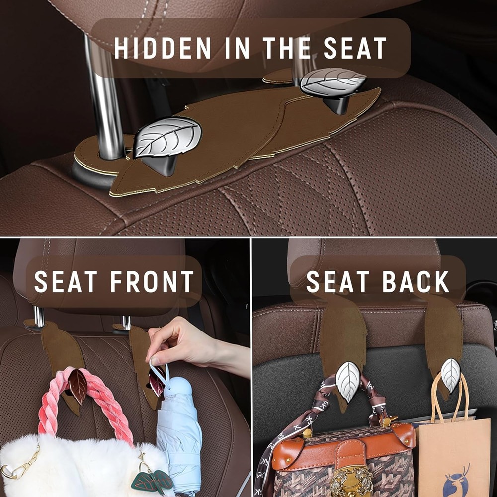 About this item [CREATE EXTRA SPACE] - This car seat hook is the perfect companion for leather seats. It's designed to hang wallets, bags, and more without taking up a bit of your passenger seat. [NOVEL DESIGN] - The exterior design is inspired by leaves, adding a touch of nature to your car while solving your car's interior arrangement. This car seat headrest hook is stronger and classier than plastic hooks, with flexible straps that hug the seat contours for a snug fit. [EXCELLENT QUALITY] - Made from top-grade leather, sturdy and durable. No more worrying about damage to your seats; this seat back organizer is designed to be kind to your upholstery while maximizing your storage space. Each hook can hold up to 55 lb (25 kg), which will meet your daily use. [EASY TO INSTALL] - No tools needed! Just attach the hooks to your car’s headrest columns. They’re cleverly designed to flip backward for the driver’s side and forward for the passenger’s side. Say farewell to your belongings rolling around on the floor. [WIDE APPLICATION] - This car storage hanger is designed to work with any vehicle, making it the go-to storage solution for every driver. Turn wasted space into storage space for groceries, handbags, bags, purses, schoolbags, umbrellas, water bottles, shopping bags, pocketbooks, and more. Package Dimensions: 7.8 x 3.9 x 0.6 inches.