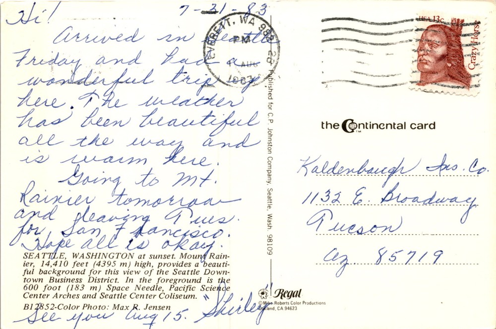 MAKE AN OFFER. THE MORE YOU BUY THE BETTER DEAL I WILL ACCEPT The postcard was sent from a person who arrived in Renton, Washington, and was planning to visit Mount Rainier, a peak standing at 14,410 feet (4395 meters) high. The postcard features a view of Seattle, Washington, at sunset, with Mount Rainier providing a beautiful background.