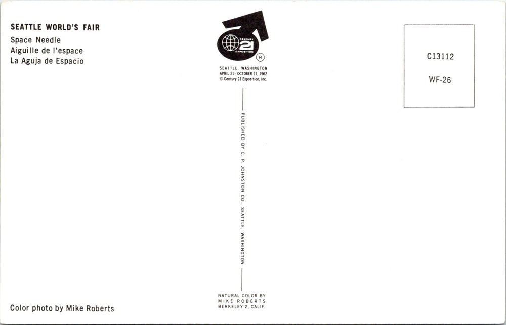 Seattle Washington World's Fair Century 21 Expo Space Needle Postcard 27603 This postcard features a bold, upward-looking view of the Space Needle in Seattle, Washington, highlighting its futuristic design against a bright blue sky with scattered clouds. Built as the centerpiece of the 1962 Seattle World’s Fair—also known as the Century 21 Exposition—the Space Needle became a symbol of the fair’s theme of science and the future. The Century 21 logo is also displayed prominently on the card. The back confirms its association with the fair and includes the structure’s name in English, French, and Spanish. The color photo is credited to Mike Roberts and the card was published by C. P. Johnston Co., Seattle.