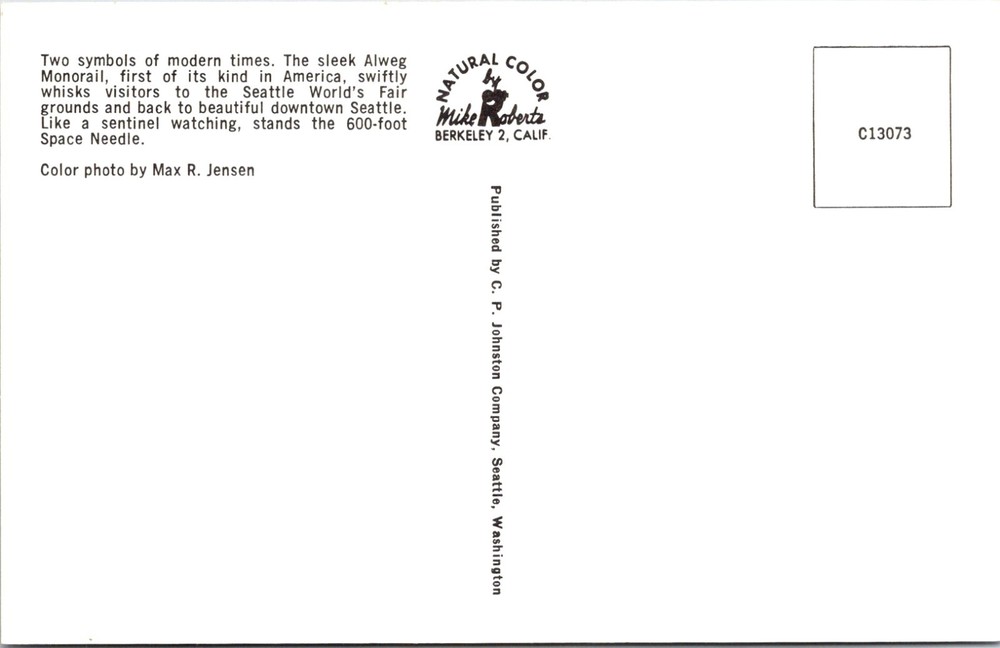 Seattle Washington World's Fair Space Needle and Alweg Monorail Postcard 27609 This postcard features the Alweg Monorail gliding above a Seattle street with the iconic Space Needle rising prominently in the background. Both the monorail and the Space Needle were built for the 1962 Seattle World's Fair, officially known as the Century 21 Exposition. The Alweg Monorail, noted as the first of its kind in America, was designed as a futuristic transportation system and provided a swift connection between downtown Seattle and the fairgrounds. The sleek design of the monorail cars and the towering Space Needle together symbolized the fair’s theme of innovation and progress. In the scene, pedestrians, vintage automobiles, and storefronts such as Ray Burners and signage for Alweg add lively detail to the mid-century urban setting, highlighting Seattle’s transformation during the era.