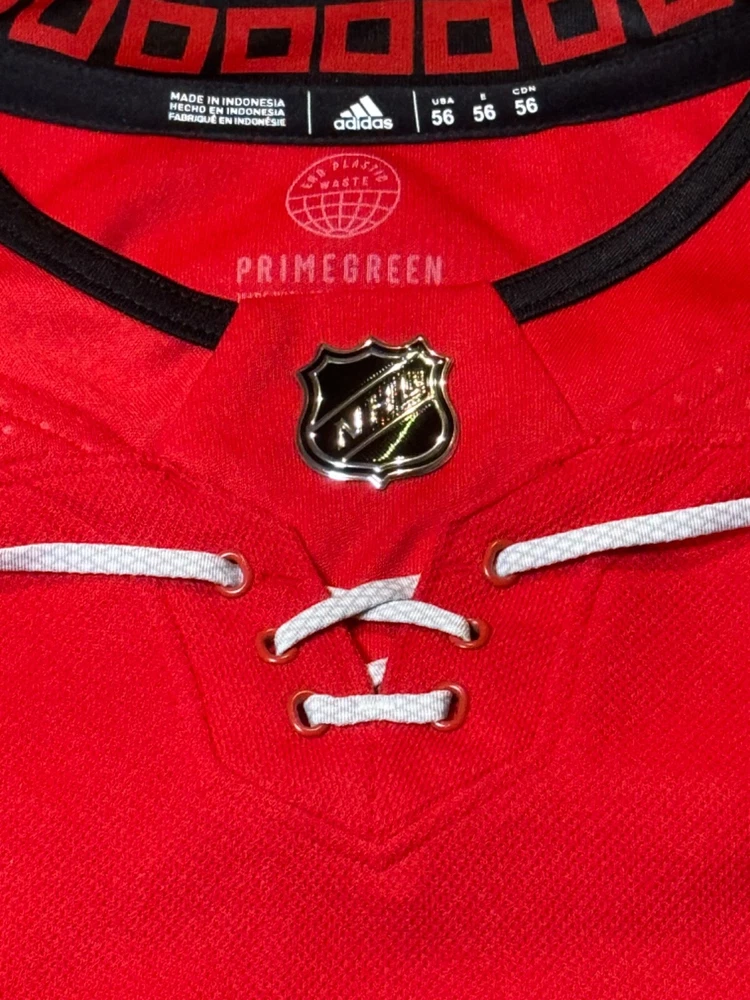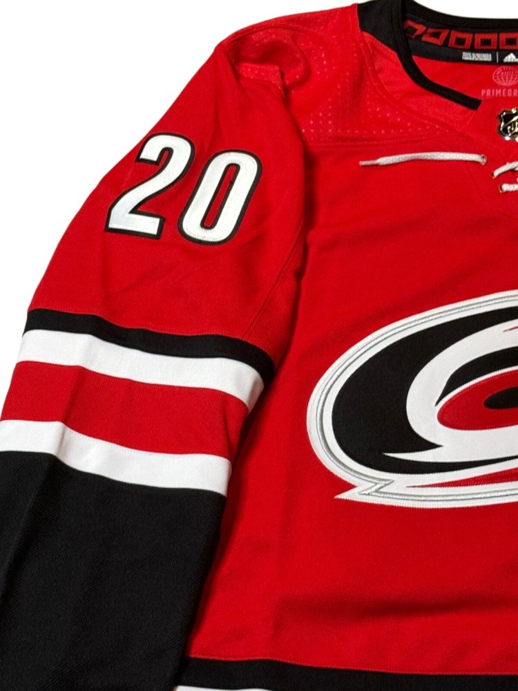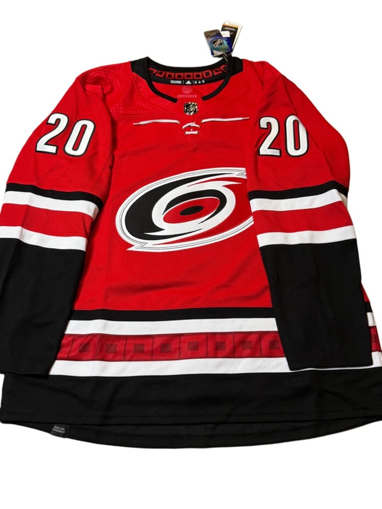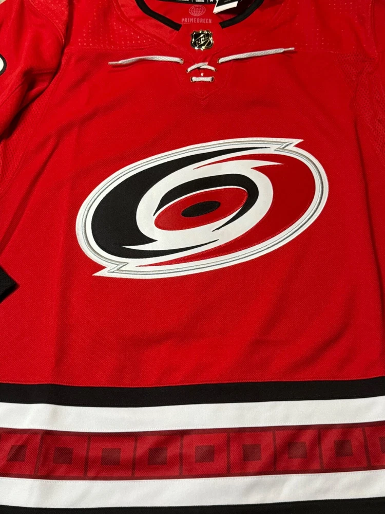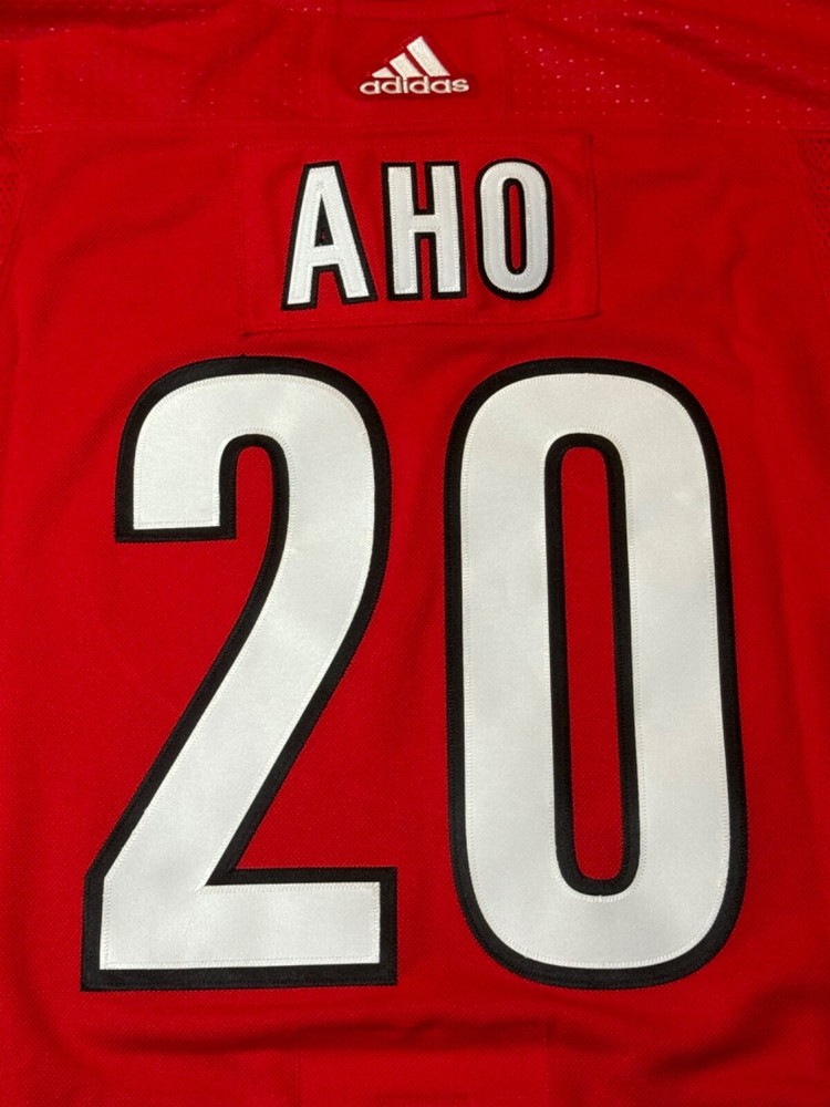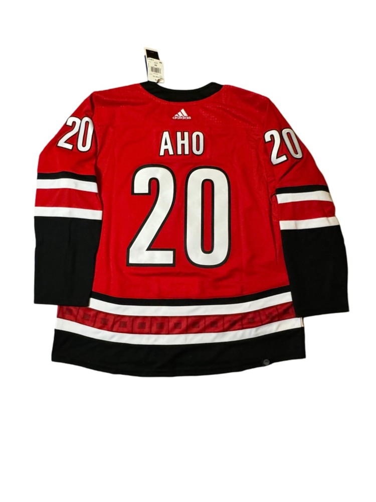 The product is a red Carolina Hurricanes jersey featuring player SEBASTIAN AHO's name. It is a men's size 50 made by adidas, officially licensed by the National Hockey League (NHL). This game jersey is designed for the regular season and is suitable for fans looking to show support for the Carolina Hurricanes and Sebastian Aho. The jersey was manufactured in Indonesia.