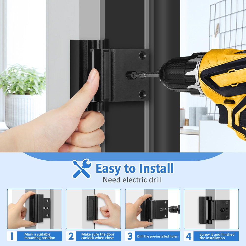 Prevent Forced Entry - Made of all-aluminum alloy, the sturdy home security door locks can withstand 800 lbs of force, 12 times stronger than a normal deadbolt, It can prevent the door from being kicked in, and ensure any door cannot be opened from the outside. This reinforcement safety door lock guards your home safe. Optimal Adaptability - It is suitable for front doors, door inside, bedroom doors, side and garage doors, and basement doors. Use this high-security door reinforcement lock to prevent breaking in. You will be much more confident in your doors being able to sustain any sort of forced entry. Home Security - This reinforcement lock has a spring-loaded design to prevent children from opening the door on their own. While locked, this reinforcement door latch protects against the door being kicked in, lock picking, and bumping and it is designed for women living alone, the elderly. Easy to Install - Each metal door reinforcement lock is equipped with a total of 8 screws including 4 long and 4 short ones, select the appropriate screws, and use an electric drill to install them within 5 minutes. Easily add an extra lock to your door, and match any inward swinging door. Easy to Use - Groove design for easy opening of the door safety locks from the inside, especially in an emergency. Unlocking and locking can be completed within a second. No tools are required to open it, just a little practice. The most convenient and fast door security device. We offer a one-year free warranty on our products.