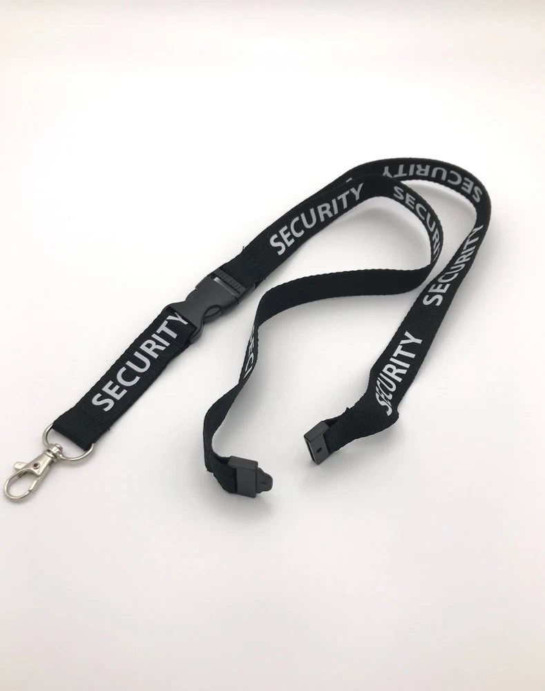 New Black (Security Lanyard) with Swivel Nickel Clip White Letters (SECURITY) Breakaway neck clip Release clip separates bottom from top Size: 18” Length, ¾” Width Ships in new clear bag