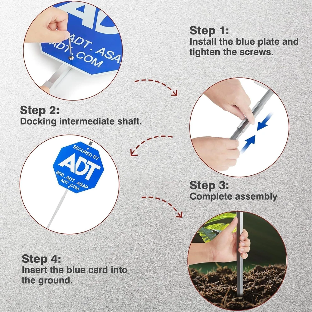 1 pcs * security yard sign aluminum + column + 8 Pcs ADT Stickers. 【Premium Material】: Our security sign is made of solid and stable aluminum, ensuring durability and longevity. 【Clear Read-in】: security sign is made of High-definition printing and capital letters are clear and easy to read, Once they see the signs, they will understand this is security sign .(We have specially reserved installation holes for the signs, which will be more convenient for you to install) 【Waterproof and Sun-Proof】: The reflective coating, UV coating, and gloss coating all work together to create a product that can withstand outdoor elements for years. 【Safety Sign Set & Easy Installation】: Includes 1 all-aluminum security yard sign,1 aluminum column and 8 Pcs ADT Stickers. The 45° angle at the bottom of the sign makes for easy insertion into any yard.