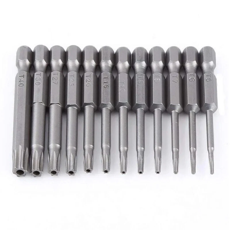 Product Characteristics High Q uality I ndustrial G rade M aterials: The Torx screwdriver bit set is made of high-quality S2 alloy steel with a special heat treatment process to increase the torque and full hardness of the bit, and it has good wear resistance and is more durable than regular Torx screwdriver bits. High P recision M achining T echnology: The product adopts CNC precision machining technology to ensure the accuracy of the product, so that the drill can withstand the instantaneous impact of large torque pneumatic tools, which greatly improves the service life of the product itself. Magnetic: The magnetic Torx screwdriver drill set can quickly and easily adsorb screws, greatly improving your work efficiency. Repeated use does not diminish the magnetic force. Suitable F or A V ariety O f P ower T ools: The 1/4" hexagon handle allows it to accommodate a wide range of power tools, allowing you to quickly change chucks. Suitable for electric drill, air drill, electric screwdriver, manual screwdriver and so on. A W ide R ange O f U se S cenarios: It can be widely used in automobile, home, industrial and other maintenance, and can also be used in other screw drives. Mechanical P rinciple D esign: Strong torque, high torque, after contact with the screw head, the impact reaction force generated by the impact screwdriver is absorbed by the torque part, effectively preventing the damage of the tool head. Straight and concentric, tight bite. Product Specification Status: 100% Brand New Material: S2 A lloy S teel Quantity: 12PCS Shank T ype: 6.35mm/ 1/4" H ex S hank Length: 1.97"/50mm Tool H ead S pecifications: T5, T6, T7, T8, T9, T10, T15, T20, T25, T27, T30, T40 Package Included 12 PCS × 50mm Torx Screwdriver B it Attention P lease 1. Please allow manual measurement error of 1-5mm. Make sure you don't mind before you buy. 2. Due to lighting effects, brightness contrast Settings of the display, etc., there may be some slight differences in the hue of the picture and the actual item, please make sure you don't mind.