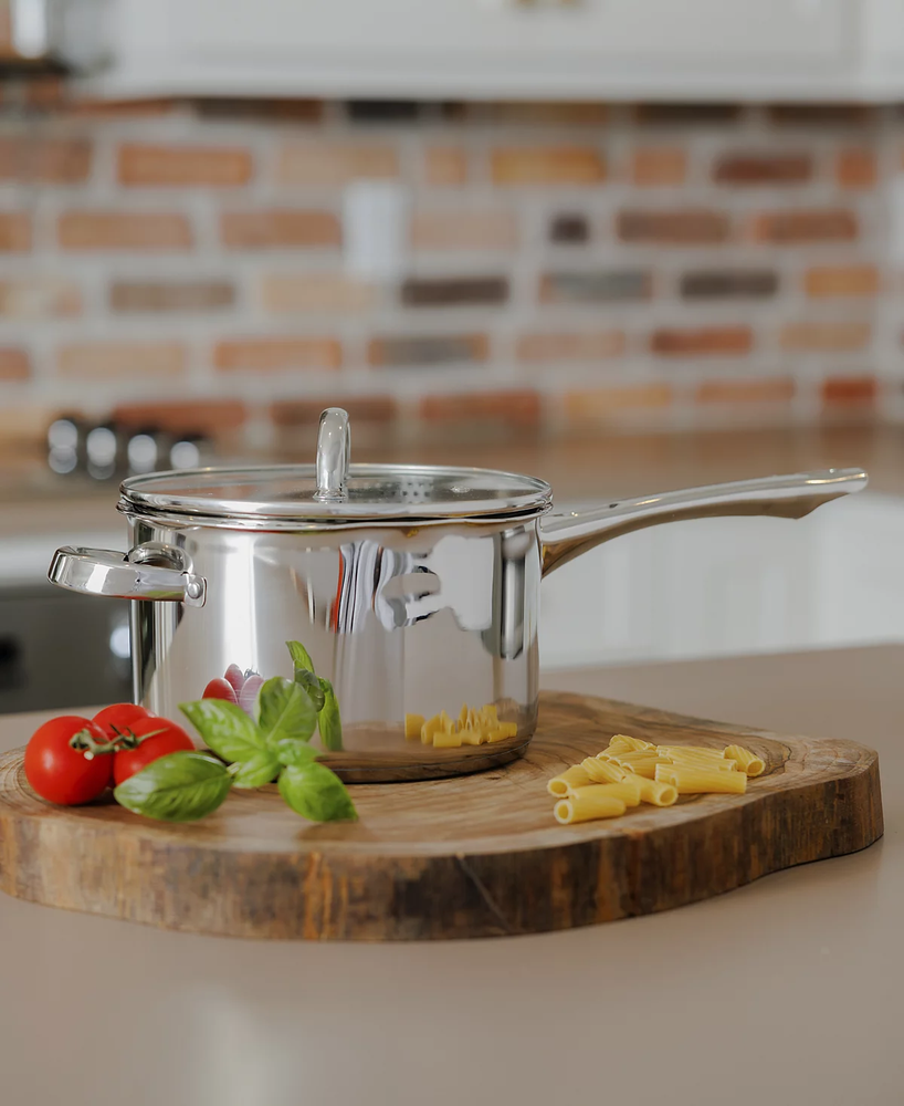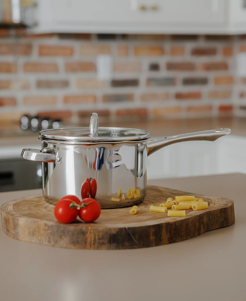 Sedona Kitchen 3.5QT Stainless Steel Sauce Pan w/ Draining Lid & Side Handle. Condition is New. Shipped with USPS Ground Advantage.