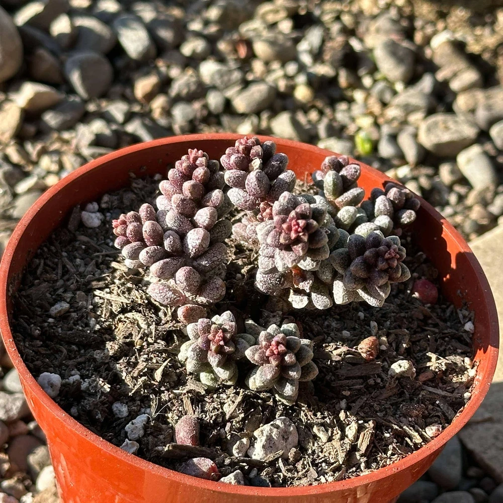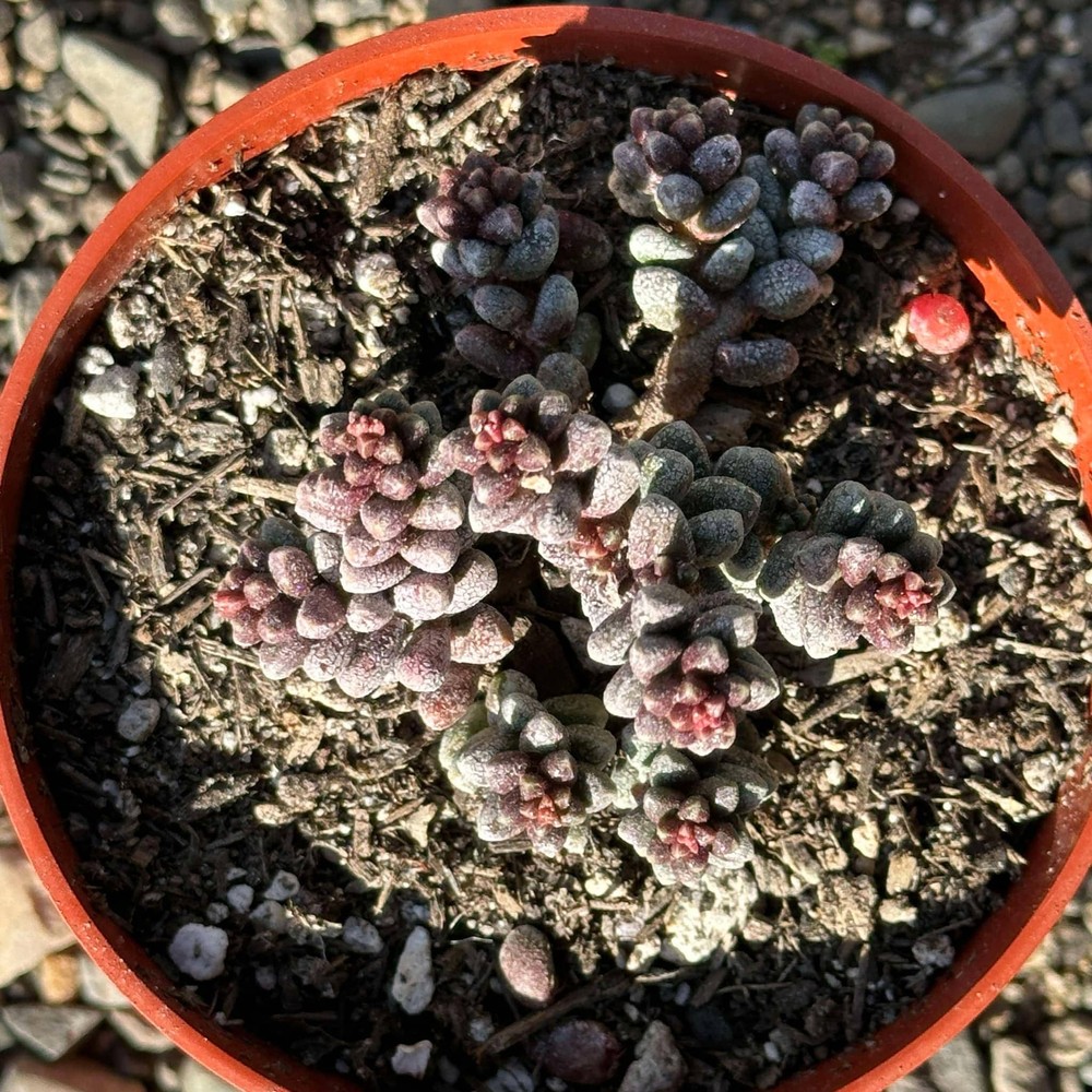 Sedum furfuraceum , commonly known as Bonsai Sedum , is a compact and slow-growing succulent that is highly prized for its unique, bonsai-like appearance. Native to the arid regions of Mexico, this plant features small, rounded, and tightly clustered rosettes of thick, fleshy leaves that are a pale, grayish-green color, often tinged with purple or reddish hues when stressed by sunlight or drought. The stems are short and dense, creating a bushy, almost miniature tree-like shape, which is why it is often compared to bonsai trees. Sedum furfuraceum thrives in well-draining soil, preferring bright light and minimal watering, making it a perfect addition to a rock garden or a potted display. In late spring or summer, it may produce small, star-shaped yellow flowers that attract pollinators like bees, though its primary appeal lies in its sculptural form rather than its blooms. This succulent is particularly popular for use in indoor gardens, containers, and terrariums, where its manageable size and striking appearance make it a standout. Like many sedums, Sedum furfuraceum is highly drought-tolerant and requires little maintenance, making it an ideal choice for those looking for an attractive, low-care plant. Please Note: Plant will ship bare root with little to no dirt, and you will receive a plant similar to the one in the photo. Fragile: leaves may curl, fall off, or bruise during shipping. Will recover with proper light, water, and leaf shedding. Returns & exchanges: Not accepted Please contact us if you have any issues with your order