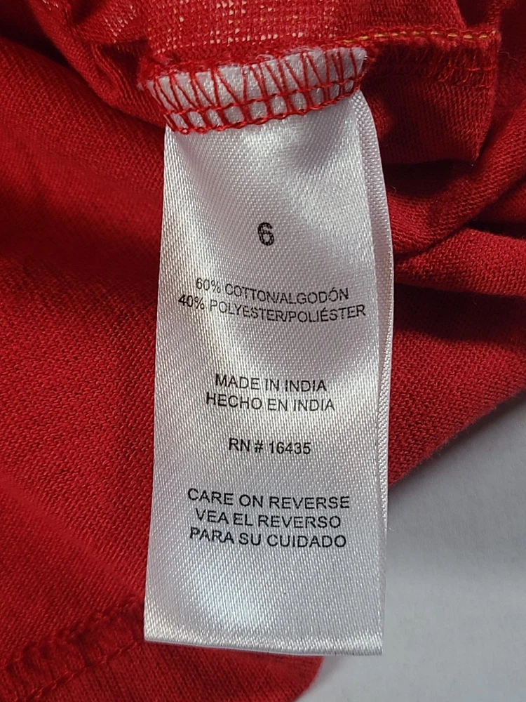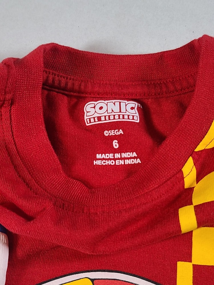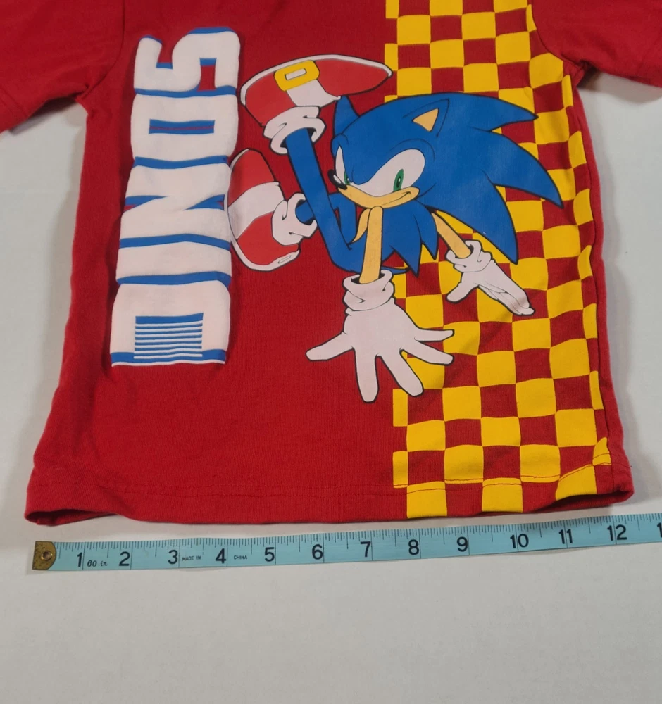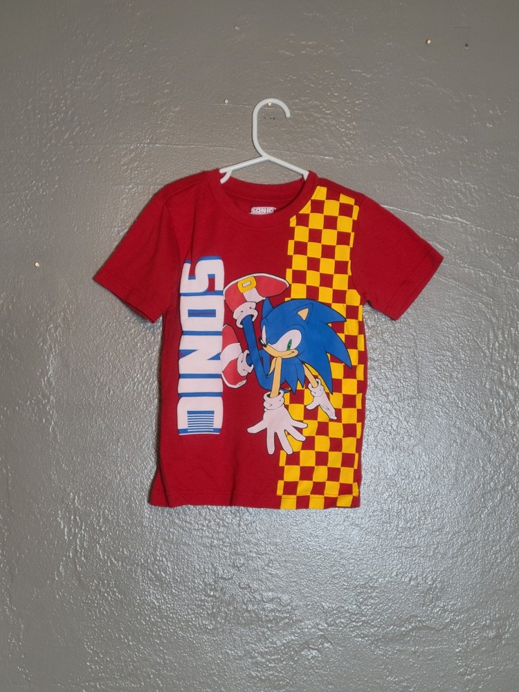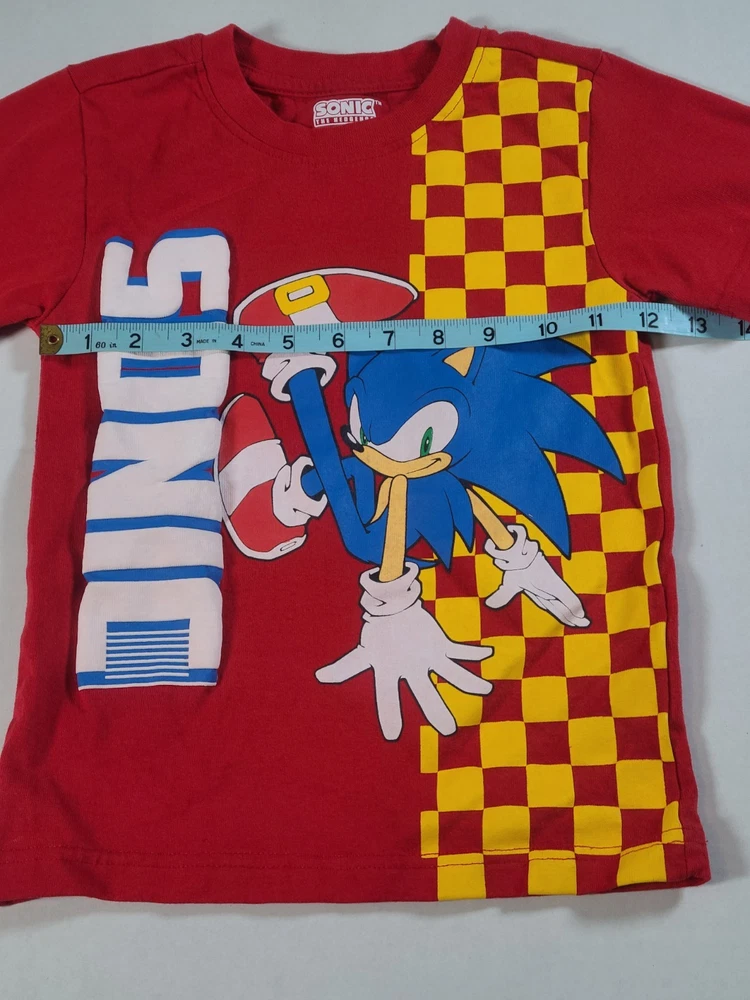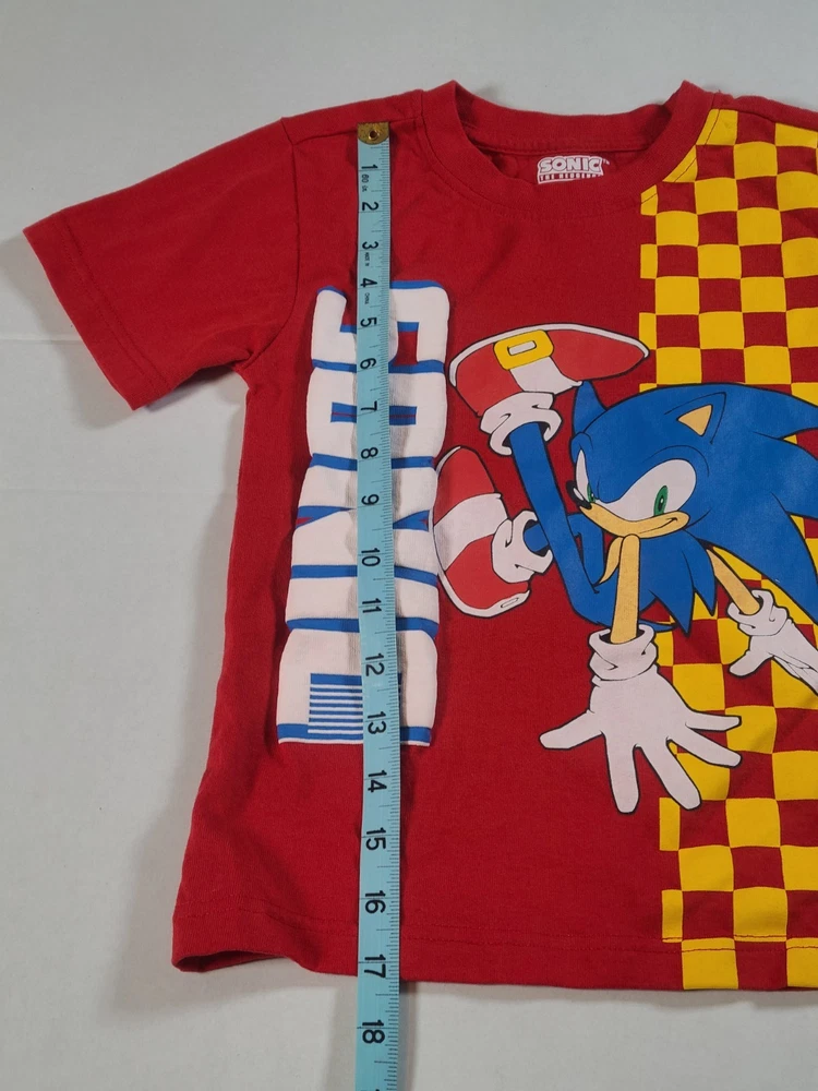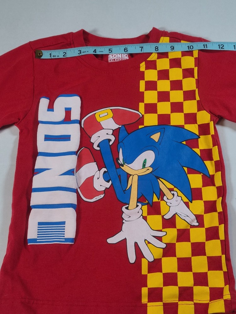 This Sega Boys Red Sonic The Hedgehog T-Shirt in size 6 is a stylish and comfortable option for young boys. Made from a blend of cotton and polyester, this pullover shirt features a crew neckline and a graphic print of Sonic the Hedgehog, perfect for fans of the character. With its lightweight fabric and easy care instructions, this shirt is ideal for a variety of occasions such as travel, activewear, and casual wear. The red color and cartoon theme make it a great addition to any young boy's wardrobe, suitable for all seasons. See photos for measurements approximate. EUC 60% cotton and 40% polyester