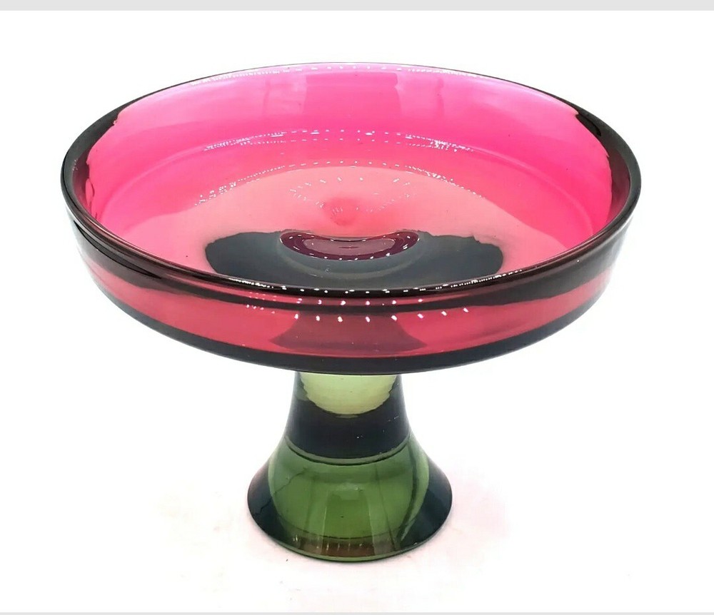 Seguso Vetri d'Arte Murano Sommerso Pedestal Compote Dish 1960s This is a beautiful Murano pedestal dish, according to the Murano glass group I sent pictures to, this is most probably manufactured by Seguso Vetri d'Arte 1960's. Here is what a group expert said " The olive green/grey is reminiscent of SVdA and Cenedese pieces made in the 1960's. Mario Pinzoni used it alot when he took over from Poli. Cenedese has used similar in sommerso etc The watermelon/pink glass reminds of colours used by Cenedese (especially in Scavo pieces). It looks a bit pink for SVdA but it could have a translucent opalina covering that would change the violet/ruby colour they use." I call it my watermelon compote, the color is the prettiest raspberry red and green, all one piece. Wouldn't you say this is perfect for Christmas! Watermelon Colors too!! Measures 7-1/4" tall x 5-1/4" across. Weighs 2 pounds 9 ounces. Excellent condition, no chips or cracks. there is some scratches on the super highly polished bottom as shown in the photo. Please message me if you have any questions, Thanks for viewing!