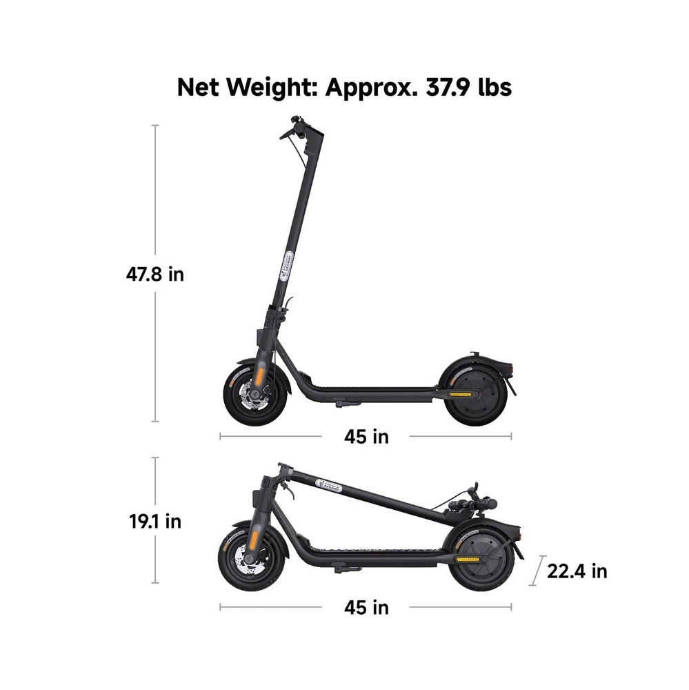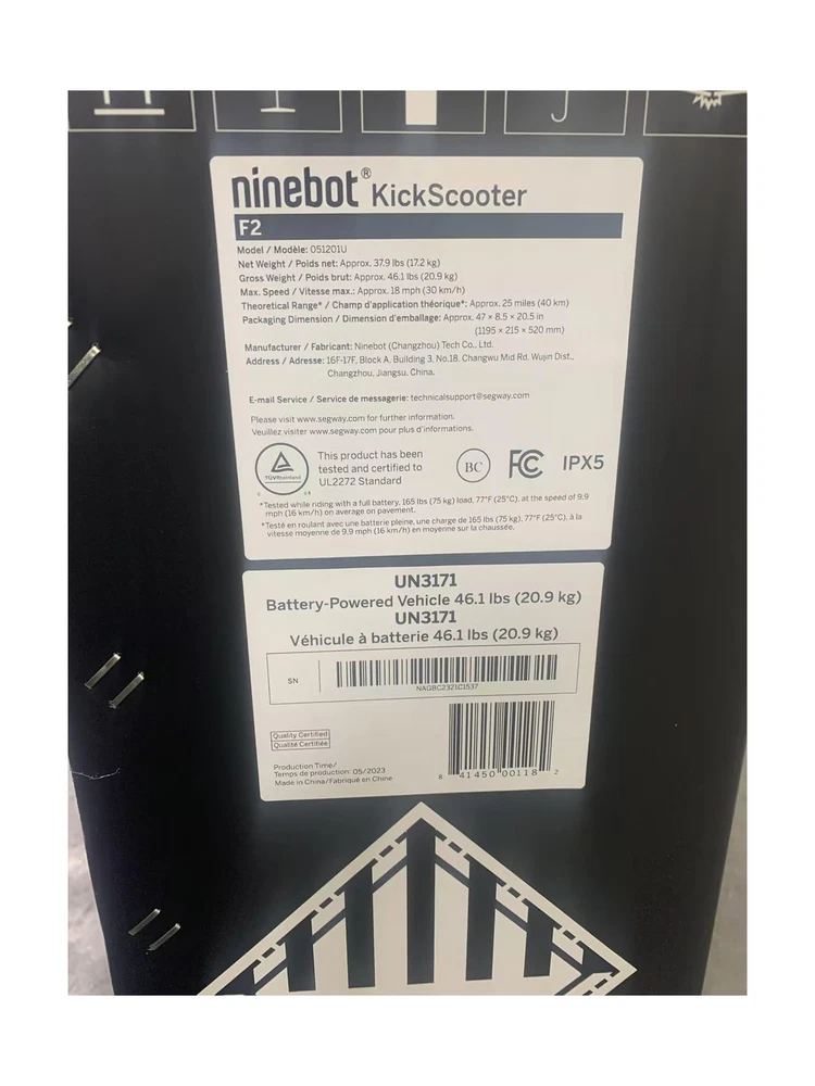 Segway Ninebot Electric Kick Scooter F2/F2 Pro, w/ 350 & 450W Motor, Long Miles Range, Up to 18 & 20mph Top Speed, Front Suspension (F2 Pro), Scooter for Adults UL-2271 2272 Certified Description Features: Speed Thrills: Experience the adrenaline rush as you reach speed of up to 18 mph, powered by a 350W motor (700W Peak Power). Extended Rides: Embark on longer journeys with confidence, covering range of 25 miles (in ECO mode). Sleek Strength: The stylish F2 effortlessly handles weights of up to 265 lbs. Safe Ride: Ensure precise control and stopping power with dual brakes, prioritizing safety during ride. Apple FindMy Integration: Easily locate your KickScooter using Apple's FindMy feature, adding convenience. City Companion: Designed for modern riders aged 16 and above, the F2 boasts a contemporary design that enhances your commuting experience. SAFE & RELIABLE: Rest assured with UL-2272 certification, providing peace of mind regarding safety and reliability. Product Details: Brand: Segway Color: Black Age Range (Description): Adult Special Feature: Digital Display, Dual Braking System, Cruise Control, Speedometer, Foldable Weight Limit: 265 Pounds Product Dimensions: 45"L x 22.4"W x 47.8"H Number of Wheels: 2 Model Name: KickScooter F2 Wheel Material: Rubber Frame Material: Aluminum Brand: Segway Color: Black Age Range (Description): Adult Special Feature: Digital Display, Dual Braking System, Cruise Control, Speedometer, Foldable Weight Limit: 265 Pounds Product Dimensions: 45"L x 22.4"W x 47.8"H Number of Wheels: 2 Model Name: KickScooter F2 Wheel Material: Rubber Frame Material: Aluminum Item Weight: 43 Pounds Handlebar Type: Adjustable Handle Height: 45 Inches Wheel Size: 1E+1 Inches Wheel Type: Pneumatic Grip Type: rubber Brake Style: Rear Braking, Front Braking Warranty Type: Limited Charging Time: 6.5 Hours Recommended Uses For Product: Commuting Maximum Distance Range: 25 Miles Manufacturer: Ninebot (Changzhou) Tech Co., Ltd UPC: 841450001182 Item Package Dimensions L x W x H: 47.09 x 20.94 x 8.43 inches Package Weight: 21.58 Kilograms Item Dimensions LxWxH: 45 x 22.4 x 47.8 inches Brand Name: Segway Warranty Description: 2-year limited warranty (refer to warranty manual for more info). Material: Stainless Steel Suggested Users: Unisex-Adult Part Number: 051201U Style: F2-25 Miles Included Components: scooter, charger, accessory box Size: F2 Date First Available: September 26, 2023 Delivery We Do Not Ship Outside of the Continental US. Return Policy All items qualify for returns within 30 days of receipt. Buyer is responsible for return shipping on any item that is not damaged. Feedback We take our reputation seriously, we buy and sell online, so we understand the value of trust. If you are unsatisfied with your order, please contact us and we will work with you to resolve it to your satisfaction.