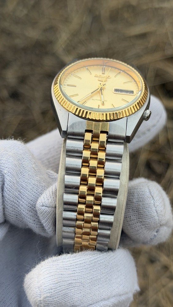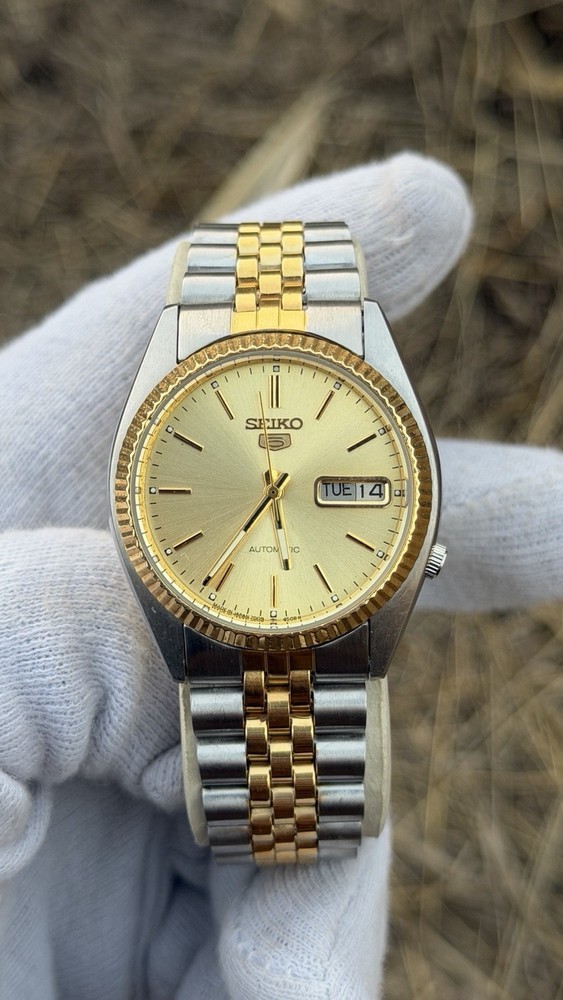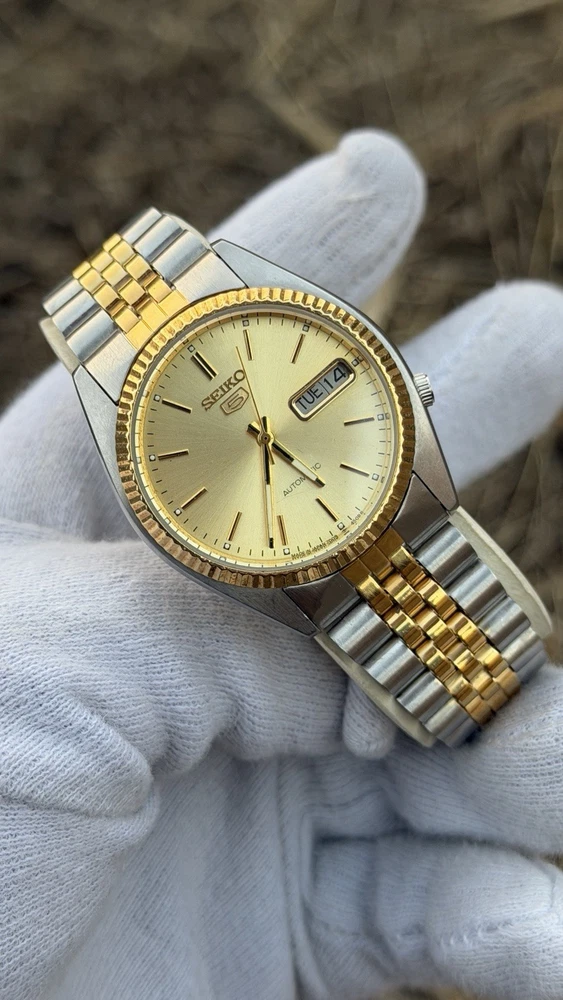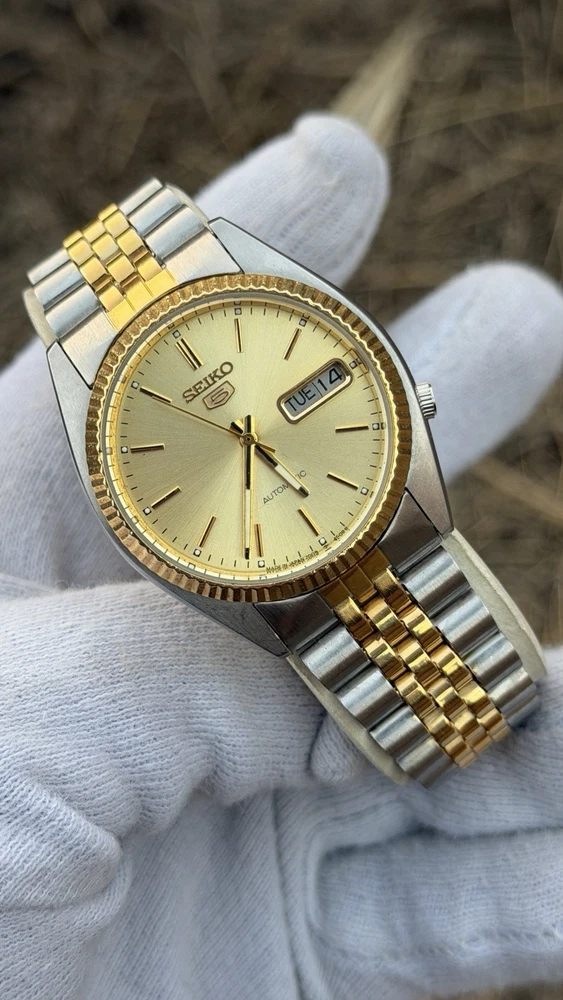 The Seiko 5 Men's Automatic Watch with a fluted bezel and day/date feature is a vintage timepiece with a classic design. This round watch has a silver dial with stick indexes and a sunburst pattern, housed in a stainless steel case with a polished finish. The watch is equipped with a mechanical automatic movement and a 36mm case size, making it suitable for dress/formal occasions. With a left-handed design and a bracelet band made of stainless steel, this Seiko 5 watch is a stylish and reliable choice for men looking for a traditional yet functional timepiece.