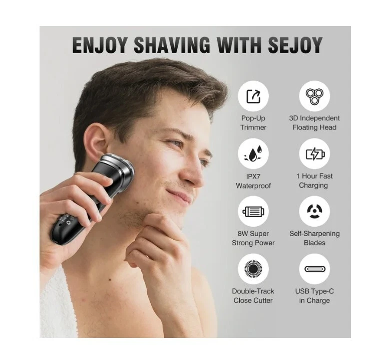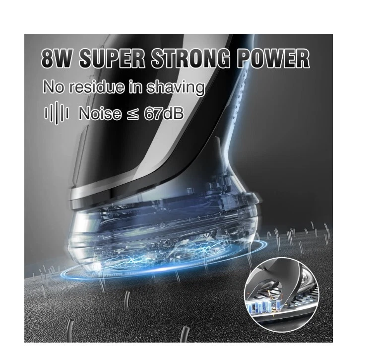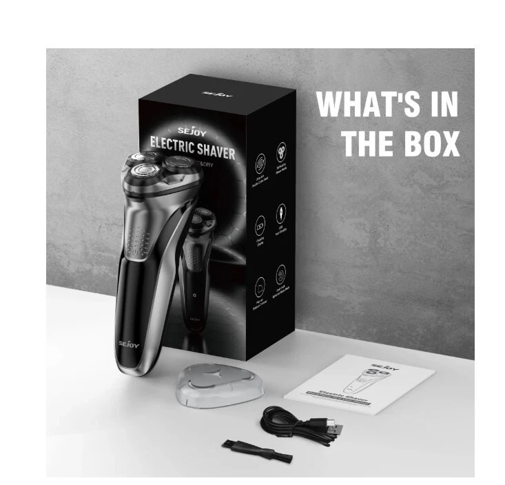 ABOUT THIS ITEM 【3D Floating & Self-Sharpening Blade】This electric razor is equipped with three independent floating blade heads with 0.11mm ultra-thin hypoallergenic double-track blade net and self-sharpening blade (18×3 blades). Does not pull and damage the skin. The 3D floating rotating shaver head automatically adapts to the contours of your face and neck for a more comfortable and efficient shaving experience. In addition, self-sharpening blades are designed for durability, saving you time when changing blades. 【Wet & Dry Use】IPX7 waterproof design suitable for wet and dry use, support foam or water shaving. You can use it as much as you like in the shower, sink, bathtub, rainy days, etc., in addition, the included cleaning brush makes it easy to clean collected hairs. 【USB Fast Charging】This men's cordless shaver is equipped with a USB cable (no USB adapter), which supports charging through computers, power banks, cars and other USB devices, etc. Enjoy a 90-minutes shave with just 1 hour of USB fast charging. Its global voltage compatibility and USB charging feature are perfect for every businessman and traveler. 【Corded & Cordless Use】This electric shaver for men is available to use both corded and cordless, so it can still be used in the future even if the battery dies. Do not delay use at any time. 【Ideal Gift & Thoughtful Service】Package Included - electric shaver, USB-C cable (without adapter), small cleaning brush, user manual. With the electric shaver, you can do shave easily every day. It is perfect gift for father,husband,boyfriend and son for for Christmas,Birthday,Valentine’s Day, Fathers Day or any other special occasion.If you are not satisfied with our men electric razor, please contact us at any time. We will answer your question as our first priority and give you the solution within 24 hours. Specifications: Product name: Electric razor Rated voltage:3.7V⎓ Rated power:8W Waterproof rate:IPX7 Note: 1.For long beards, you may get better results by first trimming your beard with the pop-up trimmer, before shaving with the rotary heads. 2.The skin may be slightly irritated during the first few shavings,which is normal. It is recommended to use the shaver regularly(at least 3 times a week)within 3 weeks to allow the skin to adapt as soon as possible.