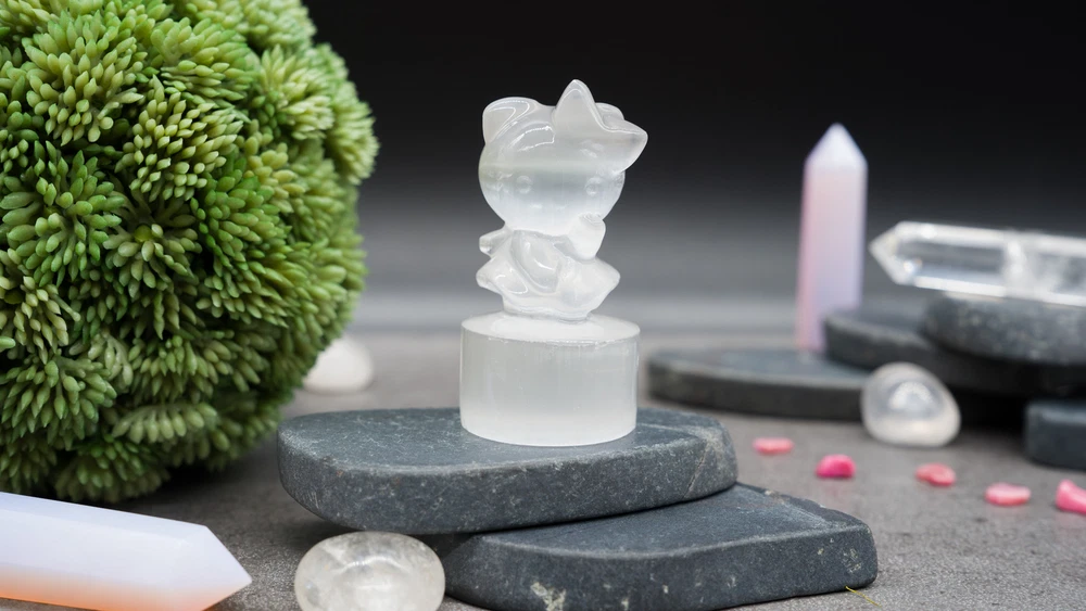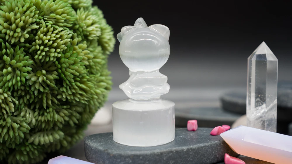 These cute Hello Kitty character inspired fanart carvings are made from natural selenite crystal (also known as satin spar) and measure approximately 2" high. They make a great gift for the crystal or Hello Kitty lover in your life! You will receive one (1) intuitively chosen crystal carving. Selenite provides for wisdom and clarity of the mind, expanding ones awareness of the self and of ones surroundings. It opens the crown and higher crown chakras and provides spiritual purity. Use for cleansing your spirit as well as your other stones! Gems and crystals are great for altars, grids, terrariums, pocket stones, gifts, home decorating, jewelry, collecting and more! They are also wonderful additions to meditation, spiritual, and chakra work. *This listing uses professional photography to provide samples of our collection of products. Each stone is natural, unique and beautiful so please expect slight variations in color, texture, and size. You will receive a product similar to that of the picture, but not the exact product. **Please note that healing crystals are not a replacement for traditional medical treatment and are not meant to replace consulting with a medical professional and do not guarantee any medical cure for any condition. ***This is not an officially licensed Sanrio product, and only features the likeness of Hello Kitty on a fanart basis.