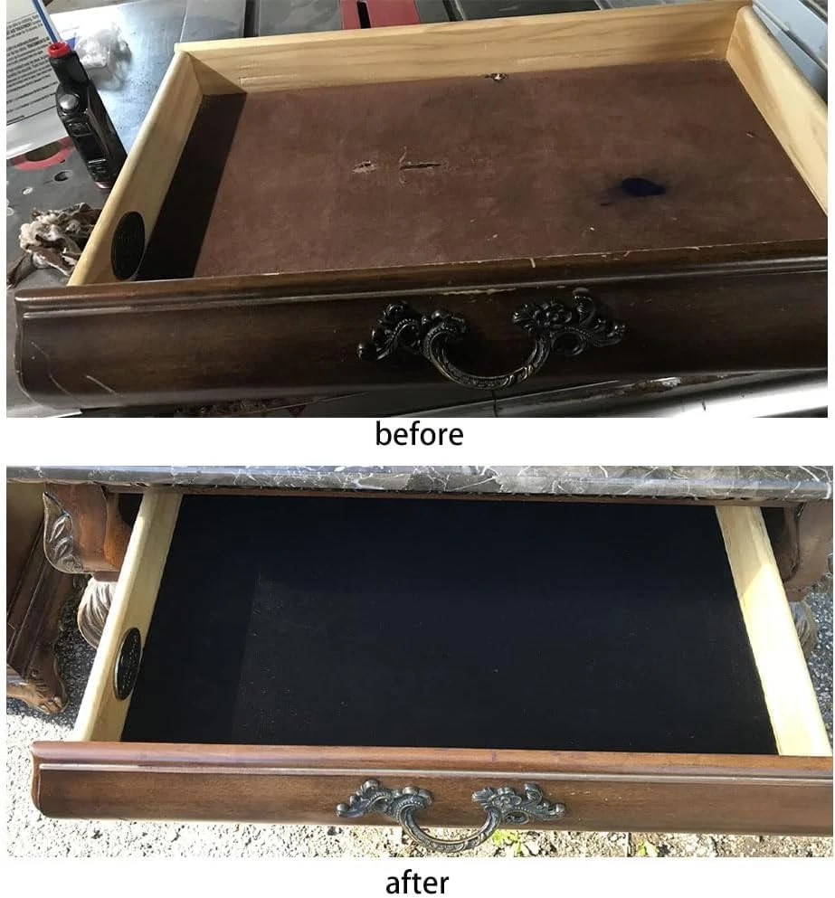Self adhesive velvet flocking paper roll support lining is used for jewelry drawer process fabric. The fabric is 15.8" x 158", Black, and the soft velvet lining (black) is used for drawer DIY Features: Easy to use Easy to cut felt, no adhesive residue when torn off, and can be used multiple times without losing adhesive properties; If it is damp, just dry it to work properly Widely used It is very suitable for backgrounds or linings. Such as display cabinets, drawer liners, jewelry wardrobes, antique furniture decoration, interior design, house decoration, clothing and clothing; It can also be used as a background decoration without damaging your paint, metal, or plastic High quality materials Self adhesive, durable and waterproof, using high-end self adhesive materials, durable, without the need for glue, long-lasting and smooth Specification: Size: 15.8" x 158", Black ▼UNBEATABLE PRICE and SIZE : per roll about 15.8" x 158"; Can be cut into small pieces freely. Velvet Thickness:1mm(Soft Warm Touch) ▼MATERIAL: This is a premium self-adhesive material for heavy-duty use, eliminates the trouble of using glue, long lasting, smooth and soft finish ▼WIDE USUAGE: Ideal for art & craft making, stationery, toy, jewelry box, bags, interior design, house adorning, garments and costumes; Also can be used to wrap anything, will not cause any damage to your paint, metal or plastic finish ▼GOOD QUALITY and CONVENIENT TO USE: the felt was easy to cut, No adhesive residue with remain on removal, can be used for several times, without losing adhesive properties; If it wet, just make it dry, and it will work normally ▼100% SATISFACTION : If there is anything wrong with our products, please us via E-without hesitation. we will provide you with excellent after-sale service and we will solve the problem for you as soon as possible. If you are not satisfied with your purchase, what we can do is to 100% to you.