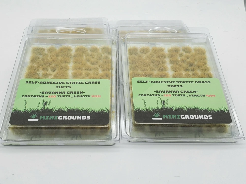 Self adhesive static grass tuft box for miniature scenery or basing in Savanna green 4mm. Color has been slightly adjusted with our new production process. There are more yellow-brown fibers in the mix, on a green base of shorter fibers making for an interesting effect. Pictures reflect the update. Easy to remove from sticker and flexible to apply to cracks and uneven spots. Box contains approx. 120 tufts with various shapes and sizes to mix and match for a more natural look. Grass made from a combination of lengths with highest being 4mm for a more 'full' or fluffy look. Terrain and base in pictures for display purpose only. If you have questions please message us for more info. Please feel free to mix and match Tufts from all our other auctions for a rebate up to 25%. Thanks for taking a look!:D *We pack and ship all our orders daily, @ 11:30AM Eastern time Monday-Friday . Sunday is gaming day so we too get to enjoy the Hobby! *Please note that our products are for ages 13+ and are not meant for consumption. *Due to the nature of some displays the actual colors may slightly vary from the pictures above. We put effort to make them appear as close as possible under regular tabletop lighting conditions indoors.