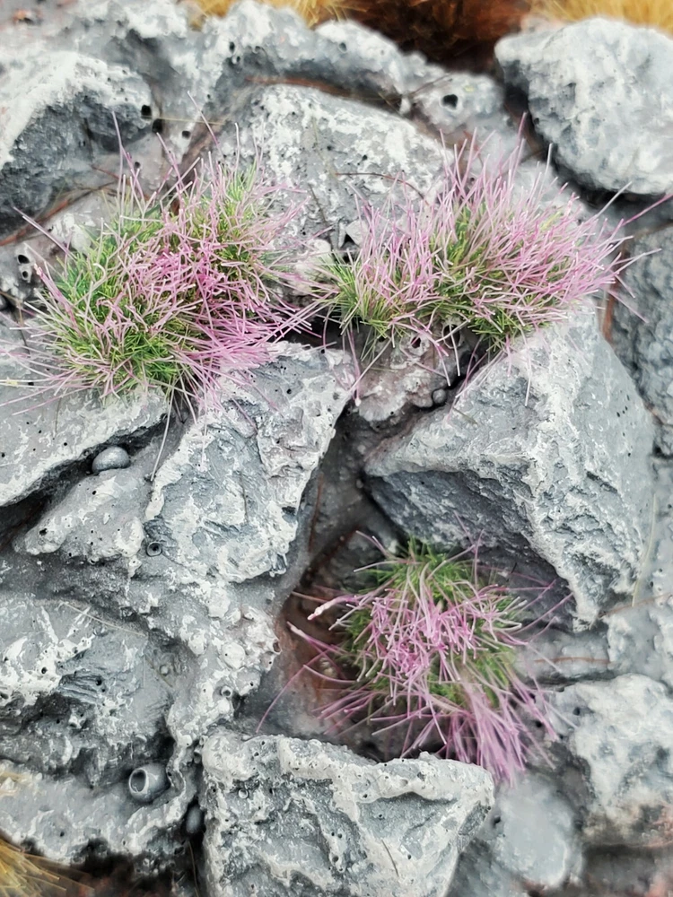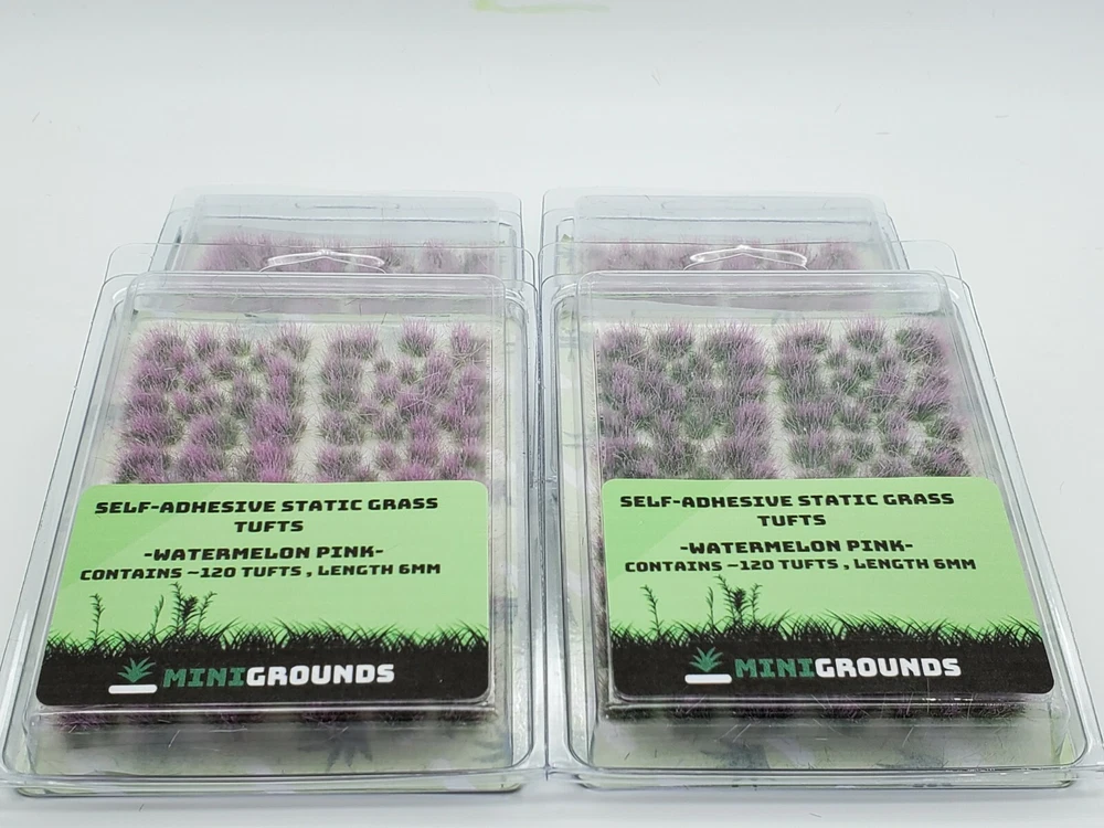 Self adhesive static grass tuft box for miniature scenery/terrain in Watermelon Pink 6mm. This color color shifts slightly depending on the angle, from the side its green on the bottom, pink on the top, from a tabletop view, 45 degree angle, it blends well showing both the green and pink parts. From a top 90 degree view it shifts more towards green. Pictures added to show all the angles. Please note this is a subtle effect and the tufts are green and pink, they arrange this way during the production process! -no magic involved ;) Very interesting effect! Easy to remove from sticker and flexible to apply to cracks and uneven spots. Each box contains approx. 120 tufts with various shapes and sizes to mix and match for a more natural look. Grass made from a combination of lengths with highest being 6mm for a more 'full' or fluffy look. Terrain and base in pictures for display purpose only. If you have questions please message us for more info. Please feel free to mix and match Tufts from all our other auctions for a rebate up to 25%. This discount will be applied automatically in your shopping cart! Thanks for taking a look!:D *We pack and ship all our orders daily, @ 11:30AM Eastern time Monday-Friday . Sunday is gaming day so we too get to enjoy the Hobby! *Please note that our products are for ages 13+ and are not meant for consumption. *Due to the nature of some displays the actual colors may slightly vary from the pictures above. We put effort to make them appear as close as possible under regular tabletop lighting conditions indoors.